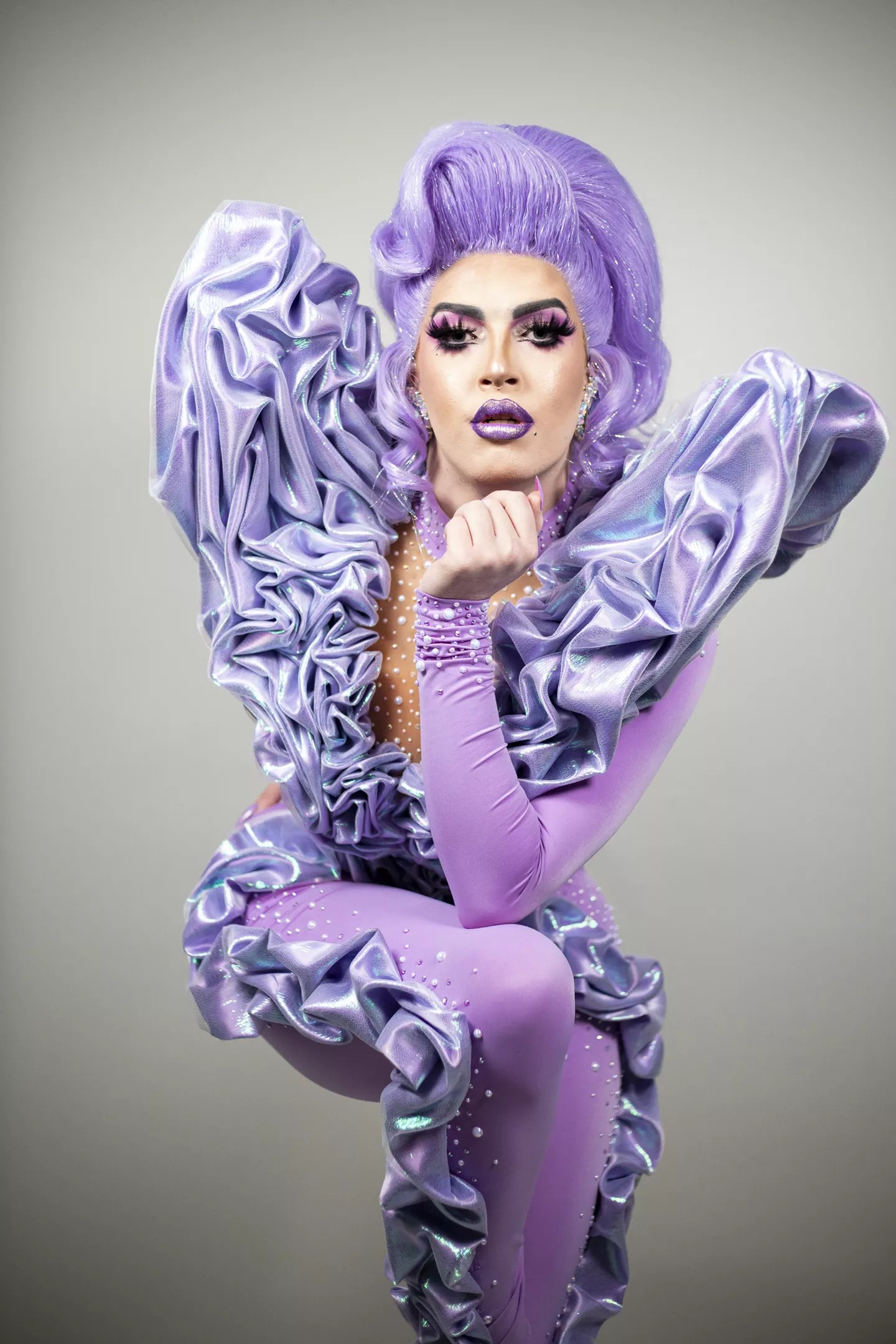 Drag style: JUICCY Misdemeanor’s drag is influenced by lots of things. She considers it to be derivative of old school, classic drag and female impersonation. She loves the illusion of drag. JUICCY’s drag is sparkly, fun, high-energy and full of joy and love.