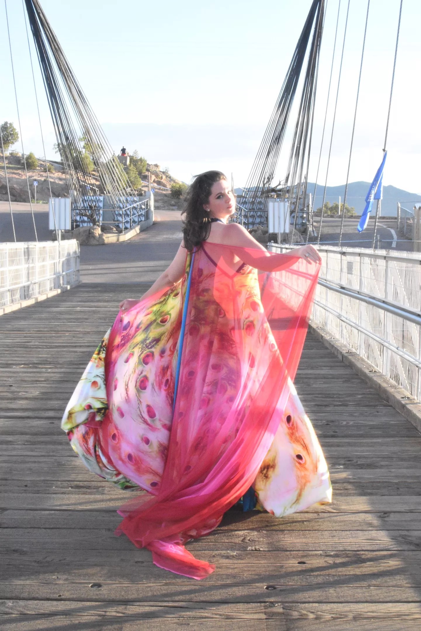 A model in a Mona Lucero gown walks an outdoor runway on the Royal Gorge Bridge.
