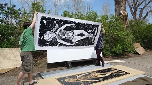 Big Ink, a national initiative bringing large-format wood-block printing demonstrations to cities across the nation, will land at the Arvada Center over the first weekend in April, putting two groups of Colorado printmakers to work with Big Ink’s unusual transportable “Big Tuna” press. Observing is free, and when we say big, we mean BIG: The press makes 4-by-8-foot prints.