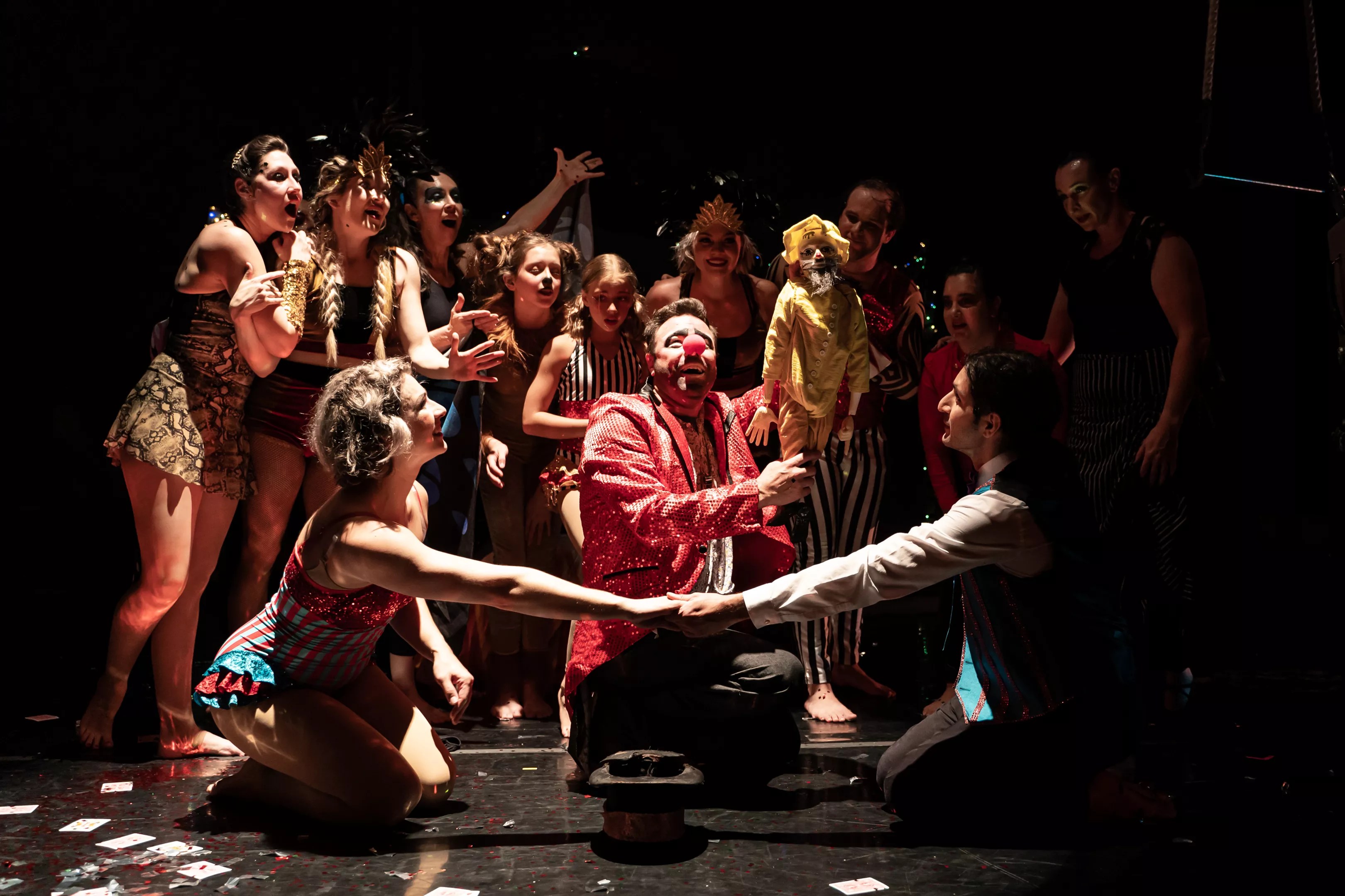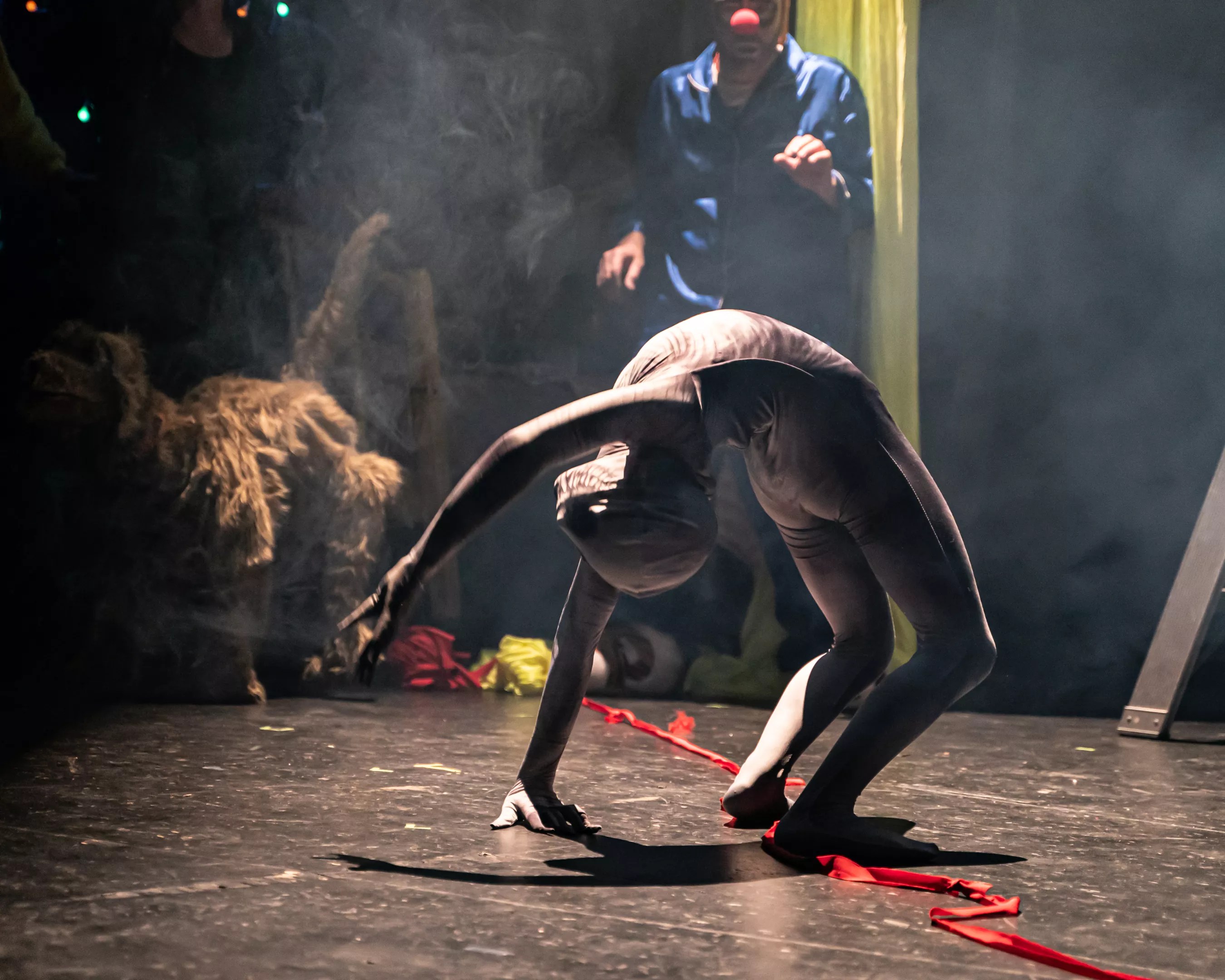 Strikingly lit, a performer bends over backwards while being surrounded by circus elements on all sides.