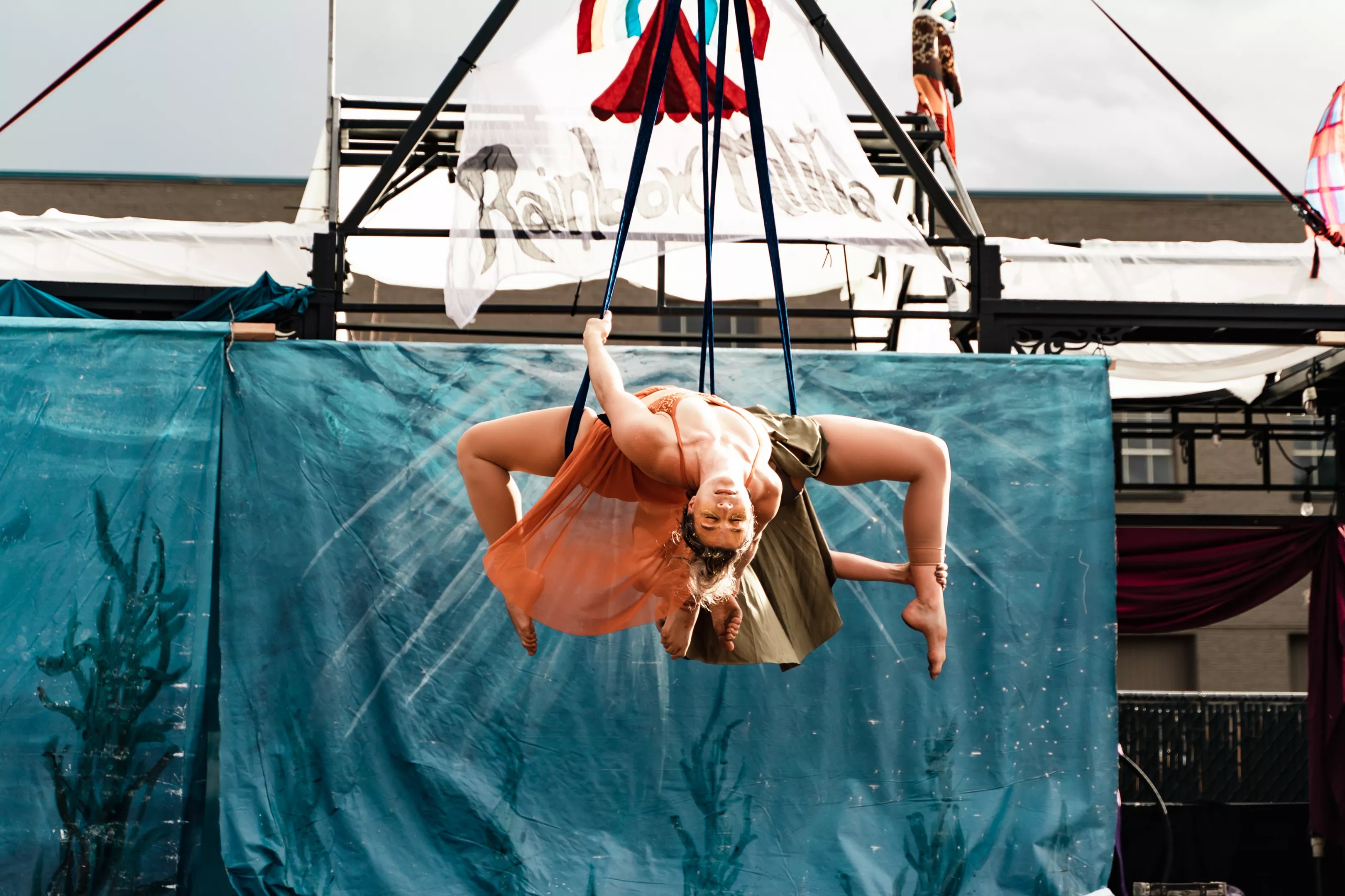 A company member of Soul Penny Circus executes a complex aerial movement.