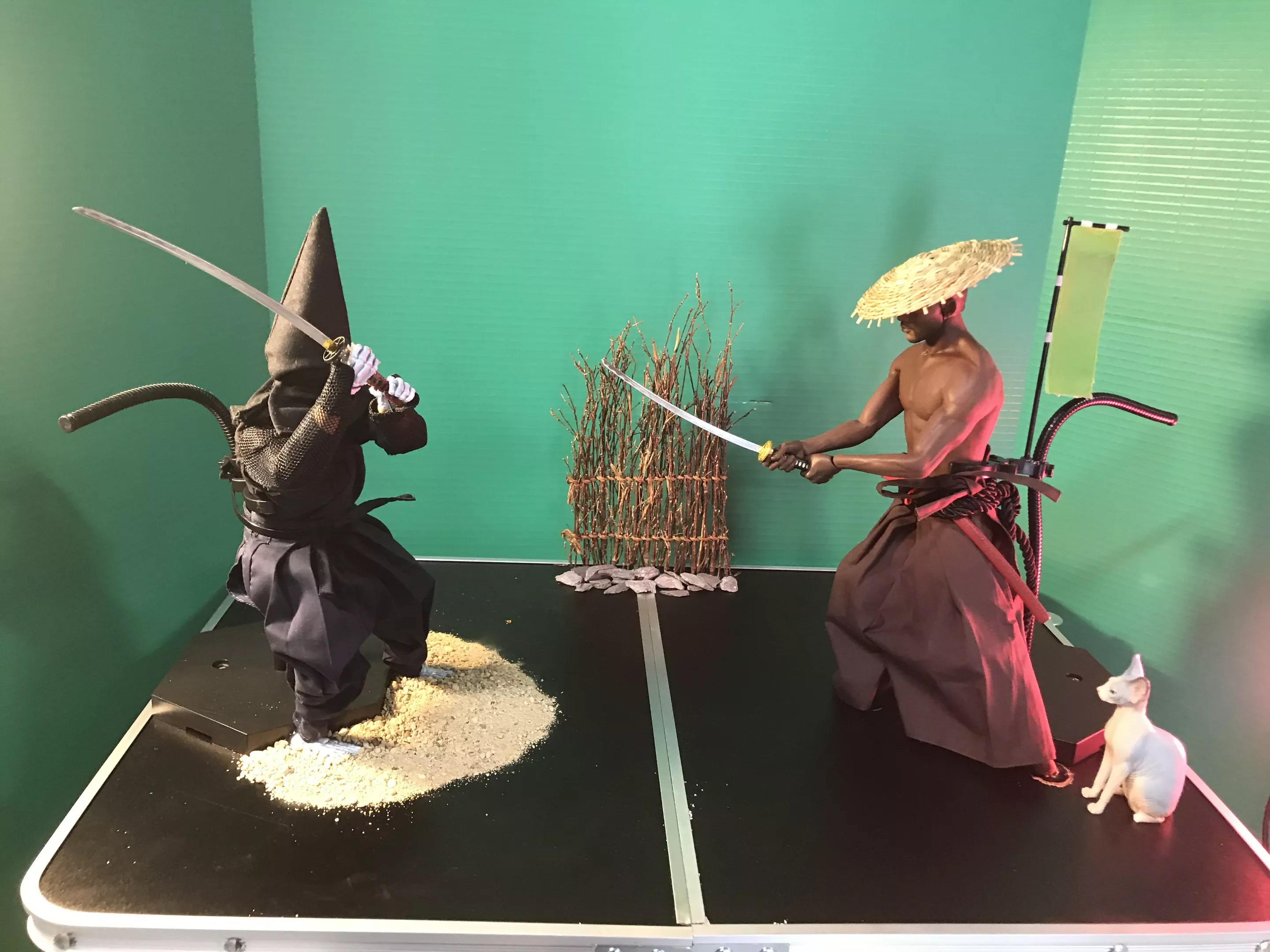 Musa and Glen are making a glorious mess of the space, which they work in all day long, every day. Half-clothed action figures murder each other, frozen in the act on a table littered with ninja costumes and tools. Prints of samurai warriors and Halloween and KKK hoods hang next to photos of Musa and Glen. Monitors, a laptop loaded with animation software, speakers and a toy-sized green screen fill the center of the room.