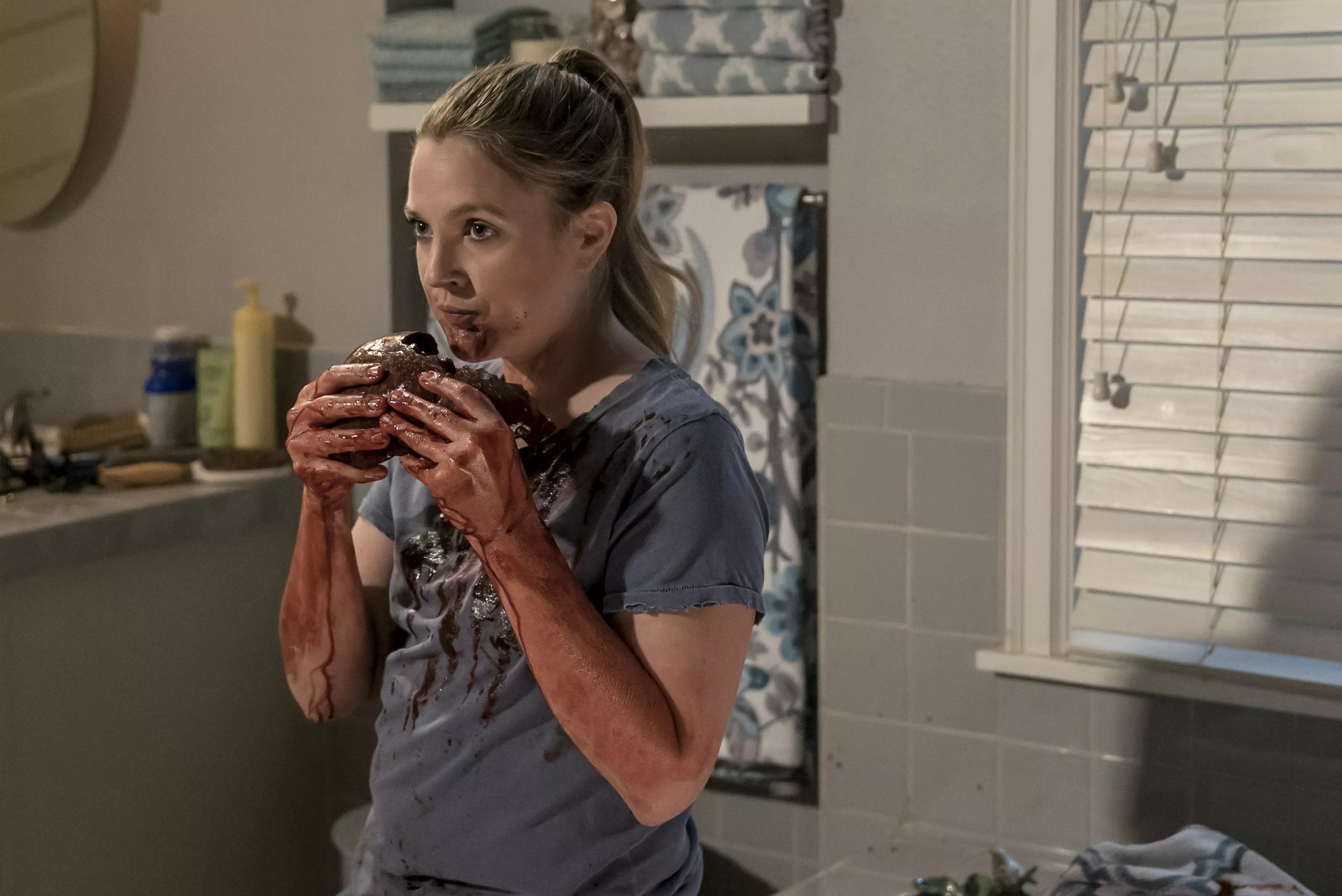 In Santa Clarita Diet, the new 10-episode Netflix original series, zombies work a little differently – there’s no groaning, loss of identity or shambling involved, though “the change” is still characterized by an incessant craving for human flesh. Sheila’s transformation announces itself when she projectile vomits yellow sludge all over a house she’s showing to a real estate client. I cannot overstate the amount of digestive refuse involved here – it is probably enough to fill the bed of a small truck.