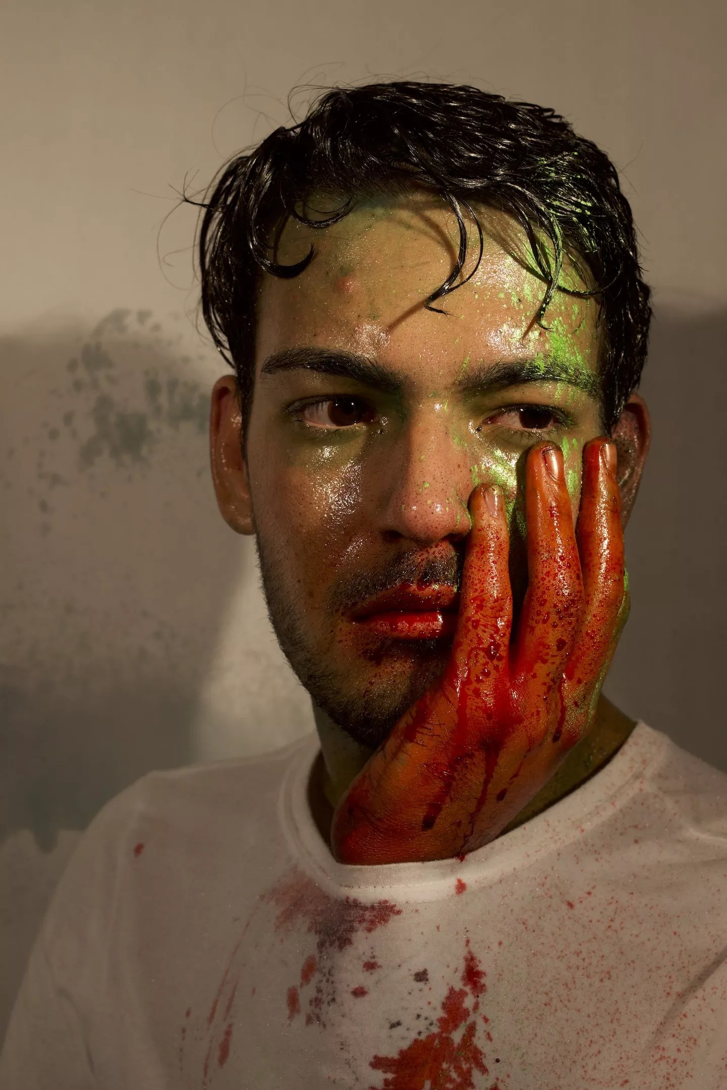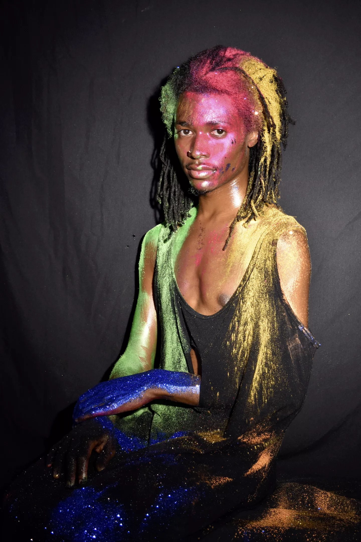 This led to performative photo shoots with participating students, who were dressed and made up in various scenarios: perhaps smeared in earth or clay, or with hair dribbled in baby oil and glitter, caught in an embrace or in uncomfortable poses. “Once I get a sense of who a person is, it serves a dual function,” Herring says. “Once I understand someone’s mental, emotional framework, that catapults me out of the fray of deadlines and stress. It becomes so real, so present, and intensity sets the stage.”