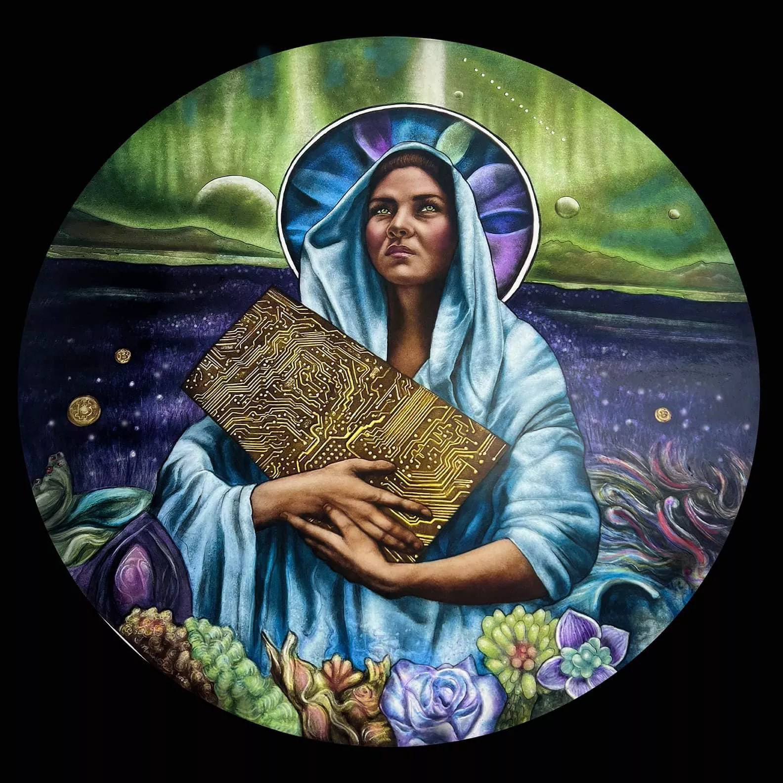 Maria Valentina Sheets, “Motherboard Madonna,” kiln-fired glass painting.