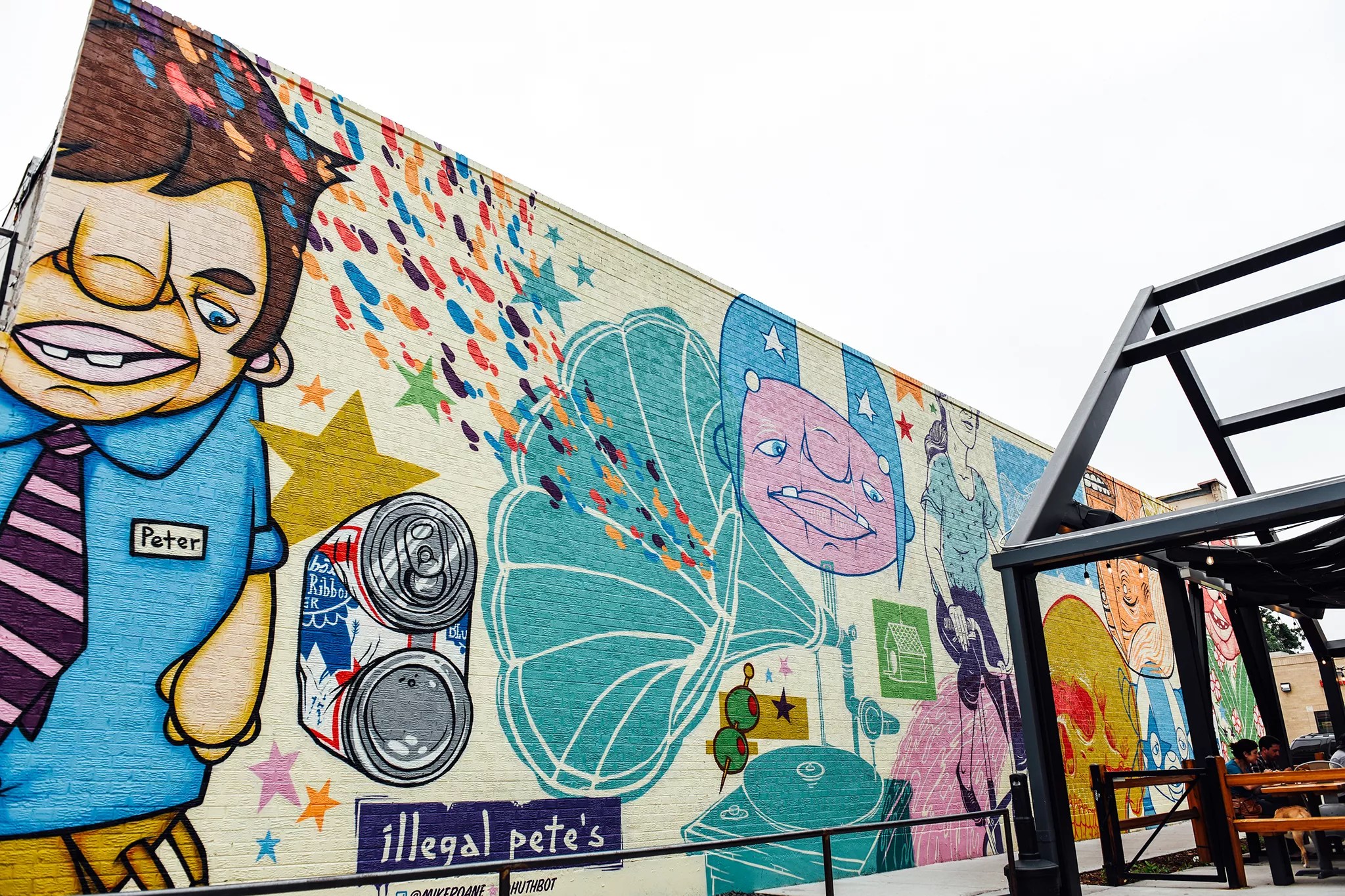Since its opening in May 2016, the Illegal Pete’s on East Colfax has become a sort of hipster haven. And what hipster hangout would be complete without some art and Pabst Blue Ribbon? Mike Graves, whose style is easy to recognize from his droopy-eye work, teamed up with Chris Huth to complete the mural.