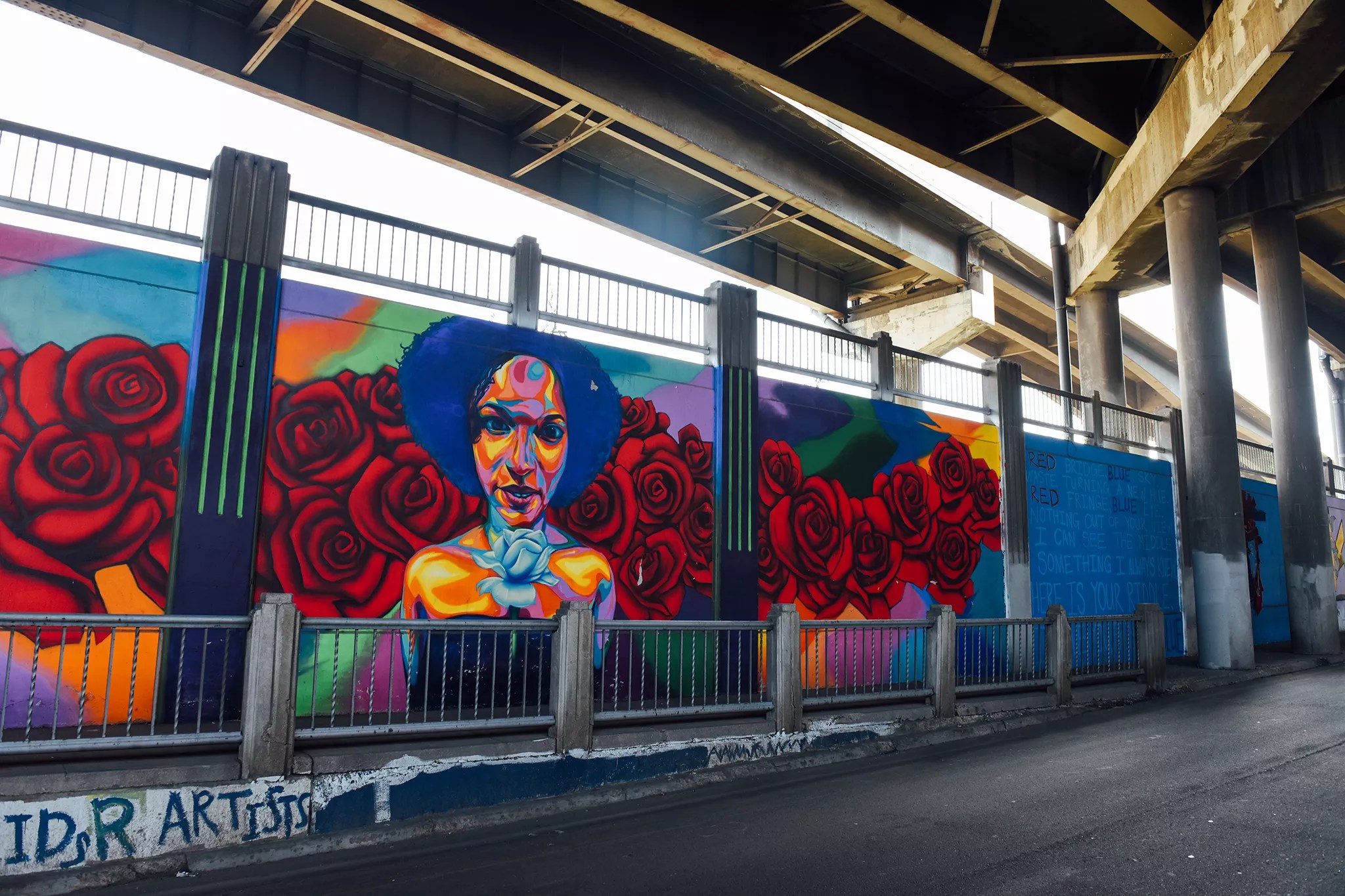 If you’ve driven over I-70, you’ve passed over some impressive street art, including this mural by Detour, which was added in October 2016. “I love the detail in the flower, the shading, the vibrant colors,” Milbery says. The viaduct will be getting some new art beginning August 18 as a part of ‘duct-work 2.