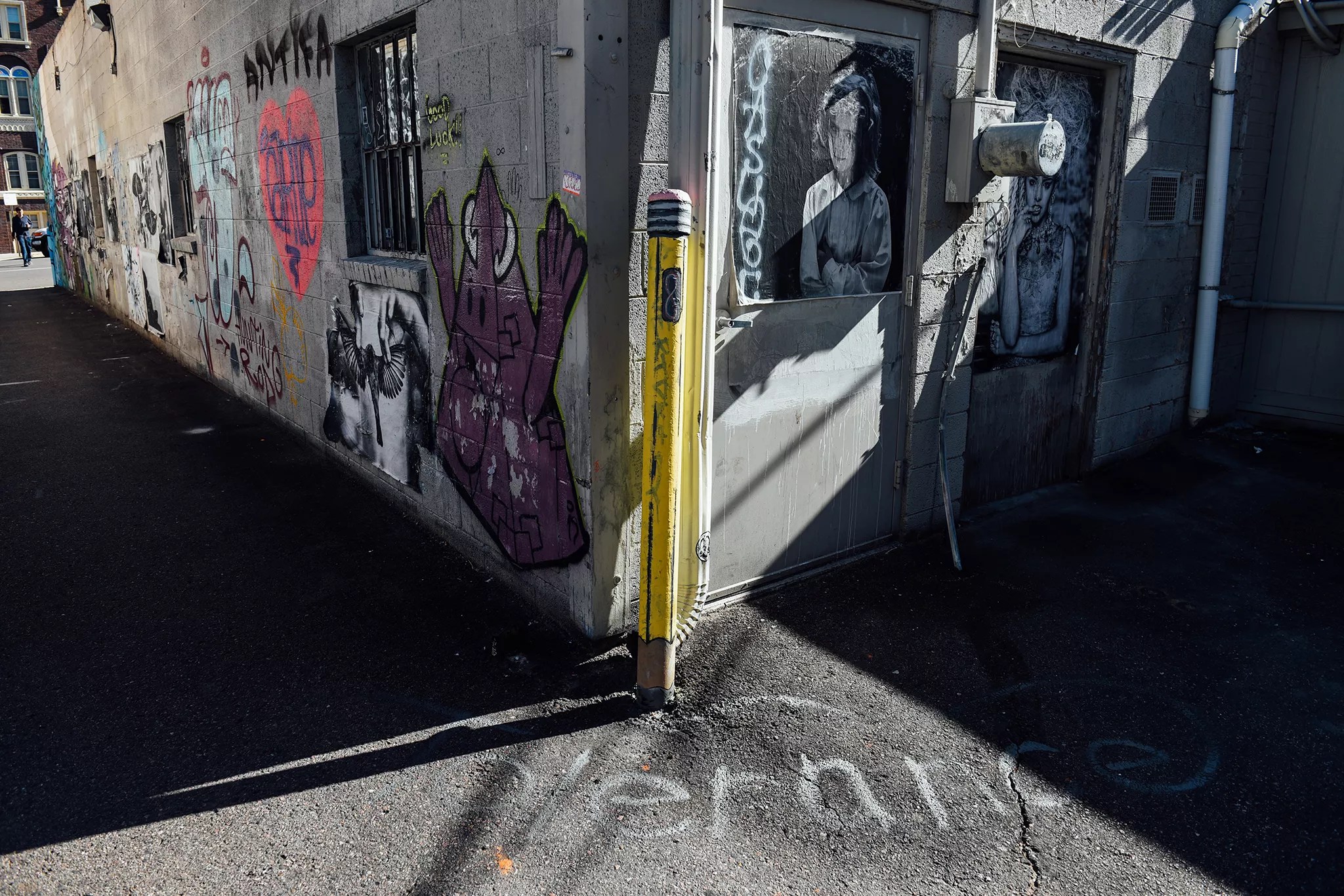Behind Buffalo Exchange and City, O’ City, there’s a motley blend of street art styles. This little pencil is a hidden detail that can easily go unnoticed.