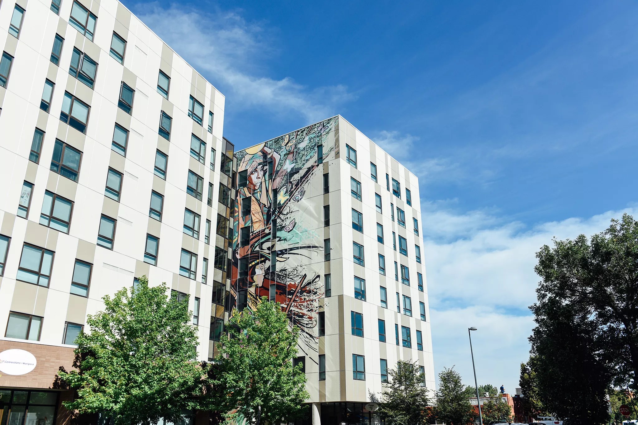 Despite its enormity, this large-scale piece near the 10th and Osage F-Line station can be missed if you’re not looking north. Approaching it from the station, you see colorful line details before the entirety of the mural is revealed. Just be sure you’re looking up.
