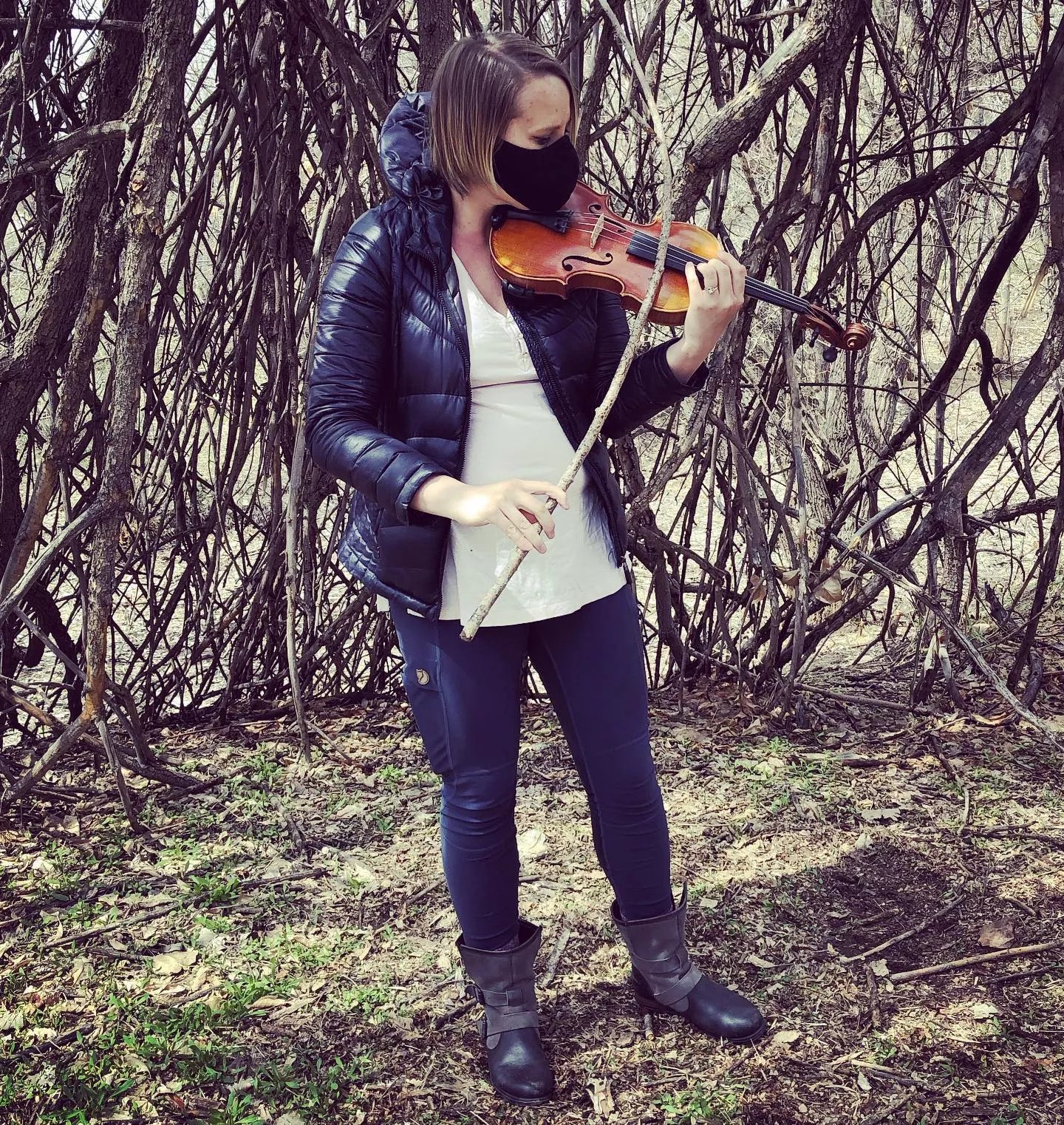 Playground Ensemble violinist Sarah Whitnah tests a tree-limb bow.