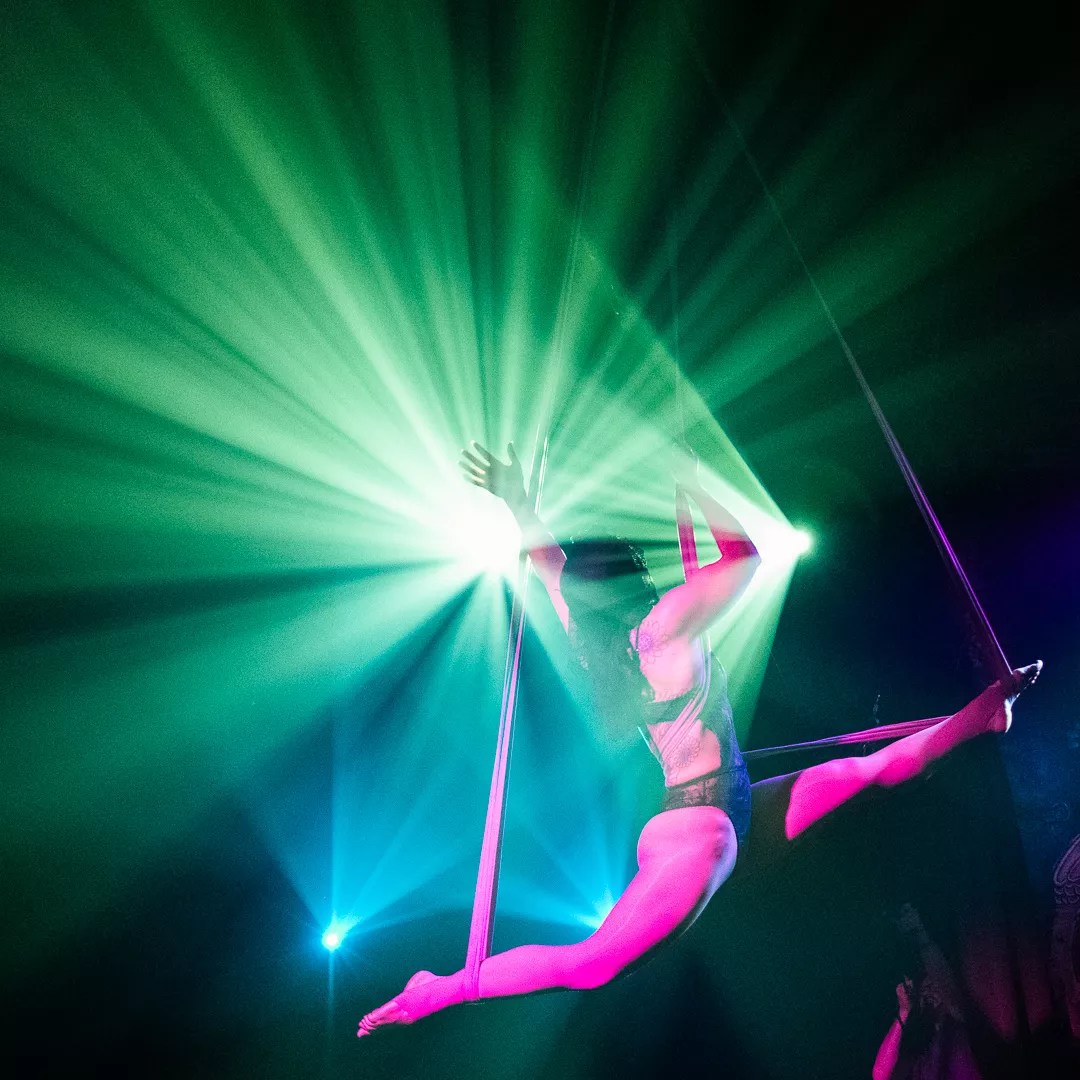 Our stunning aerial trio, representing the Three Fates, will weave your destiny on an all-new invented apparatus created by Amy Haderer. It includes a mobi, which is a trapeze-and-lyra hybrid, forged by VVolfy Metalworks here in Denver. It includes hand-braided loops and tails made out of green tricot. We are so excited to open the show with this innovative apparatus and its accompanying movements to a new, original song.