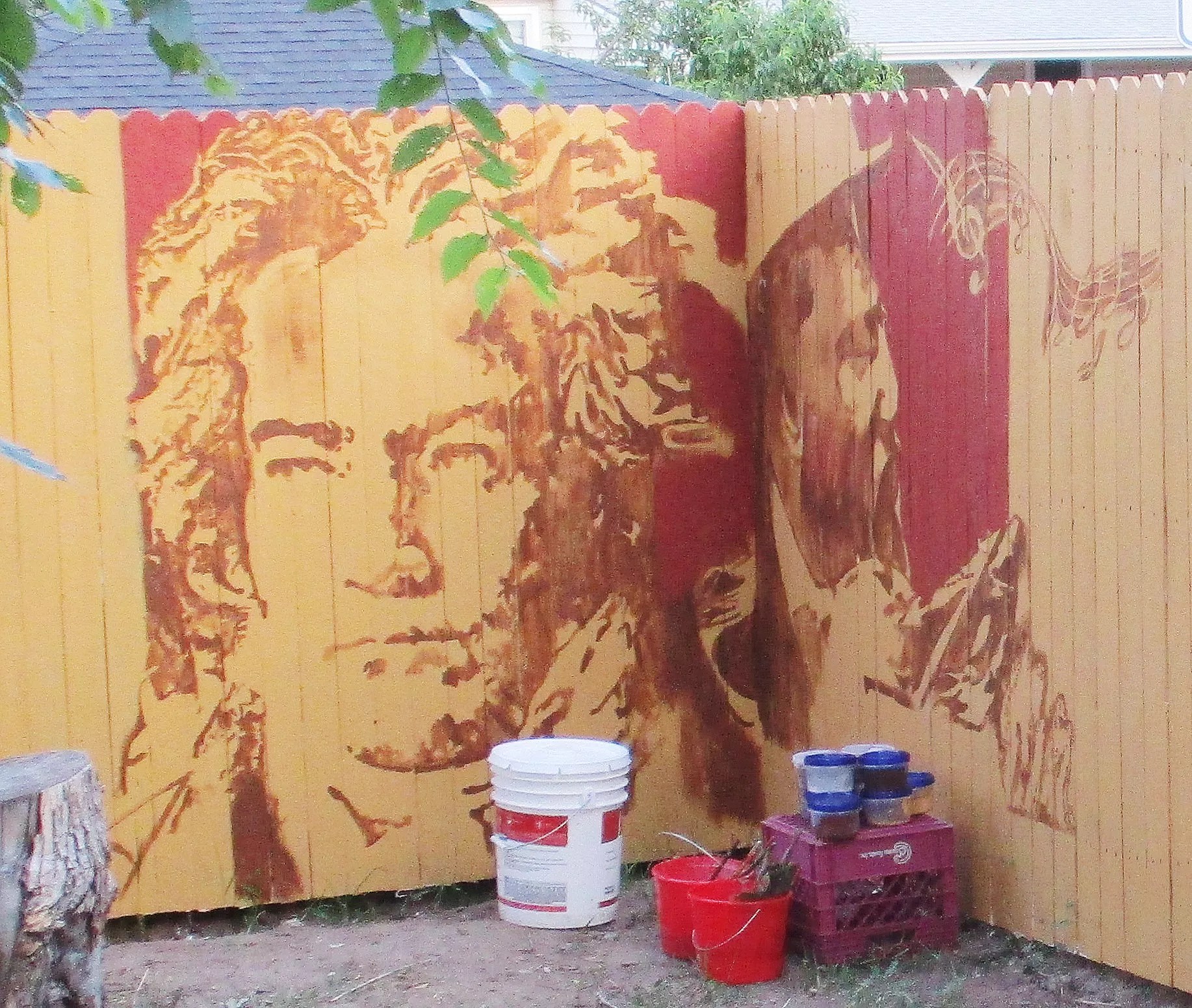 Now the metro area has a Hurley mural of its own – a cool-toned orchestra of acrylic jazz legends obsessively scumbled over a rough cedar fence. Employing Alexis Catala and Izaac Tafoya, two apprentices from his alma mater, and a projector in place of fresco, Hurley is transforming a quiet suburban back yard into a roaring jazz club.