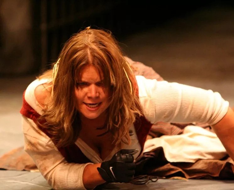 Phamaly is a Colorado treasure, a theater company made up entirely of performers with disabilities, perhaps the only such company in the country. These disabilities range from obviously disabling to barely perceptible on a stage, though they may be severe. Barrett has multiple sclerosis. Some years ago, the company fielded a deaf Dorothy who sang like an angel in The Wizard of Oz; she was accompanied by a blind Cowardly Lion. The slight tremor you noticed in Adelaide during Guys and Dolls added a vulnerable, sexy-sweet touch to Lucy Roucis’s portrayal. And no one who saw 2009’s Man of La Mancha can forget the rape scene during which a wheelchair-bound Aldonza, played by Regan Linton, was thrown violently to the floor and then spent several agonizing minutes crawling away from her tormenters.