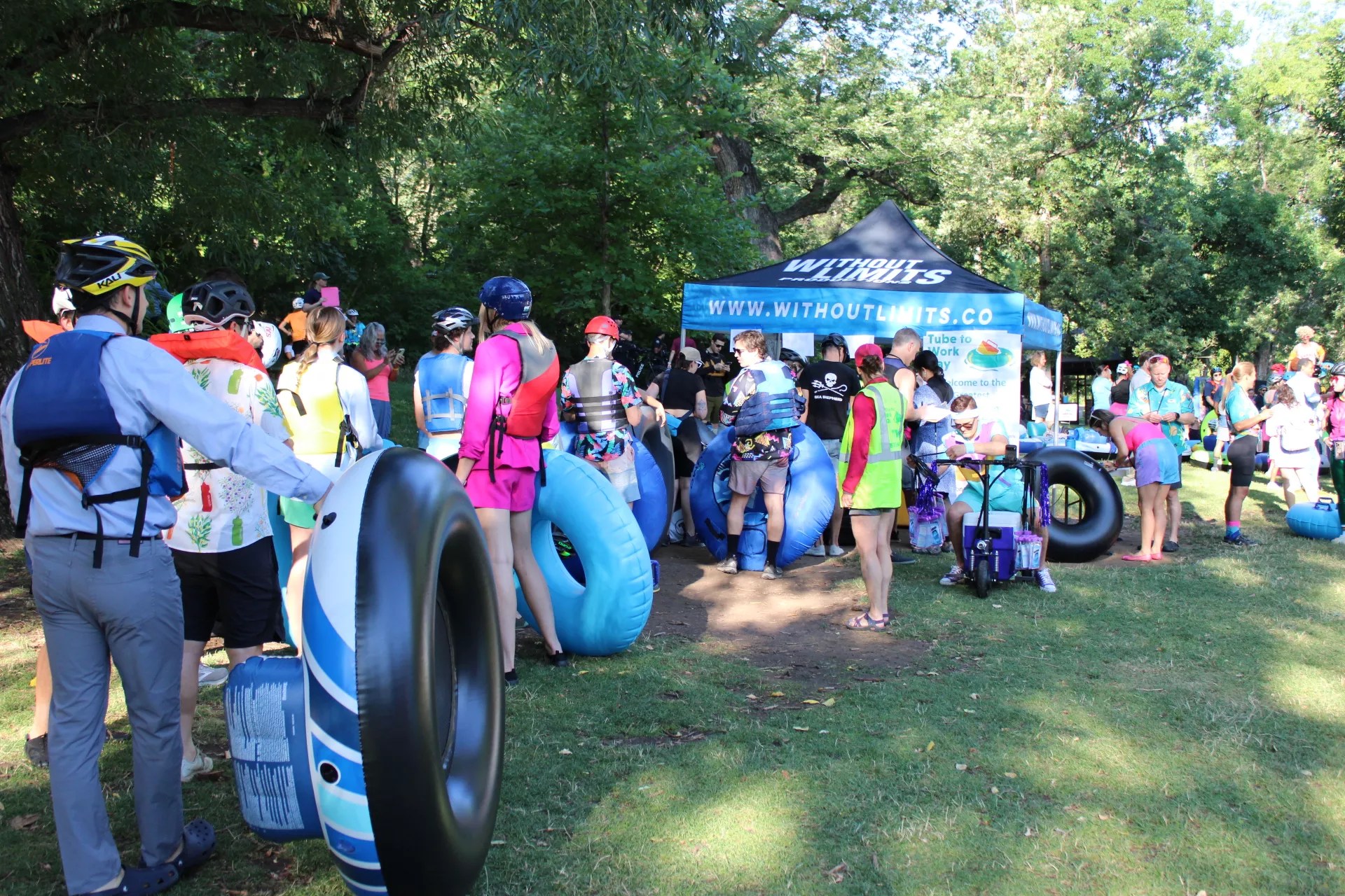 People leave Boulder Creek at the end of the 18th Tube to Work Day near Central Park.