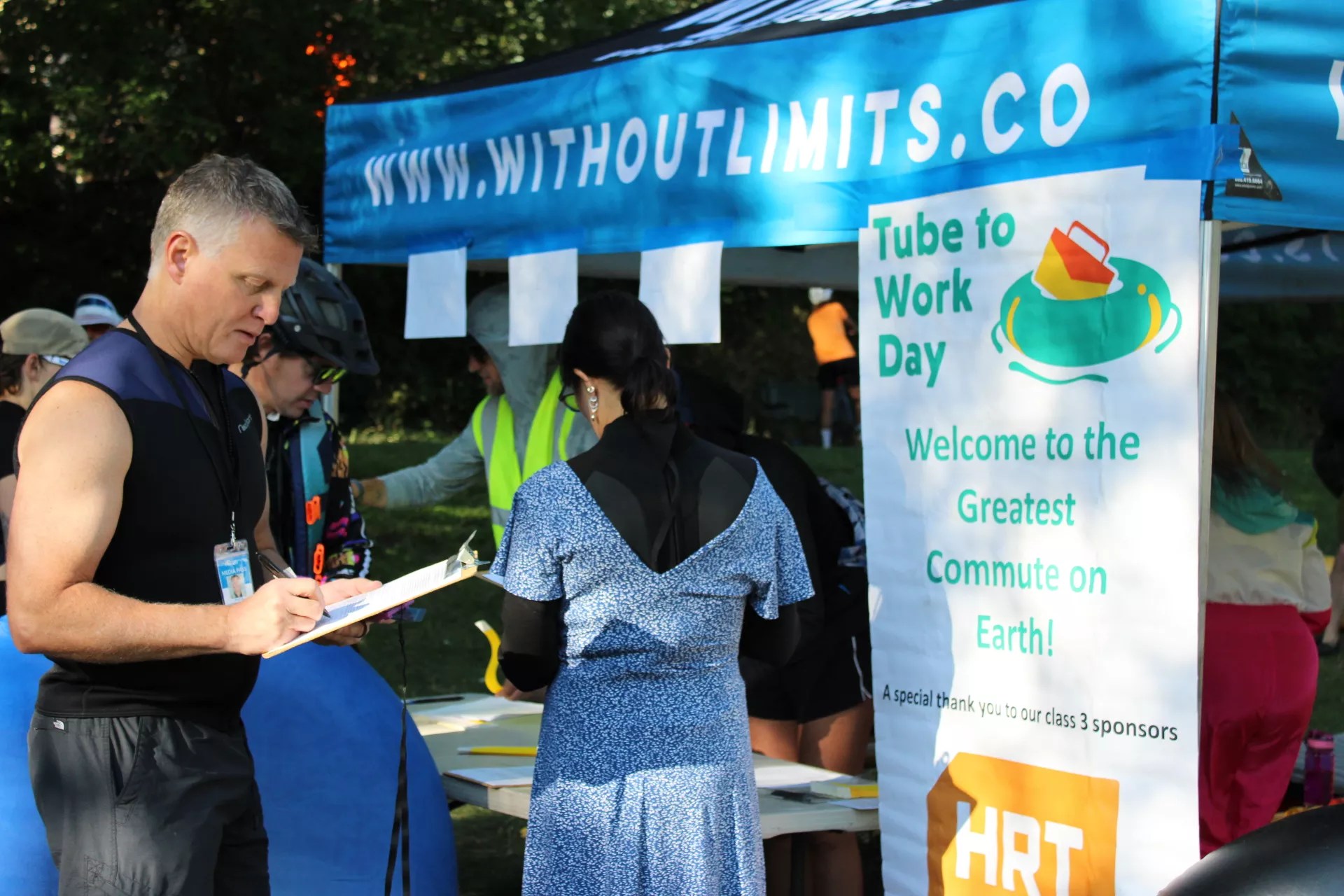 People walking to enter the Boulder Creek at the 18th Tube to Work Day.