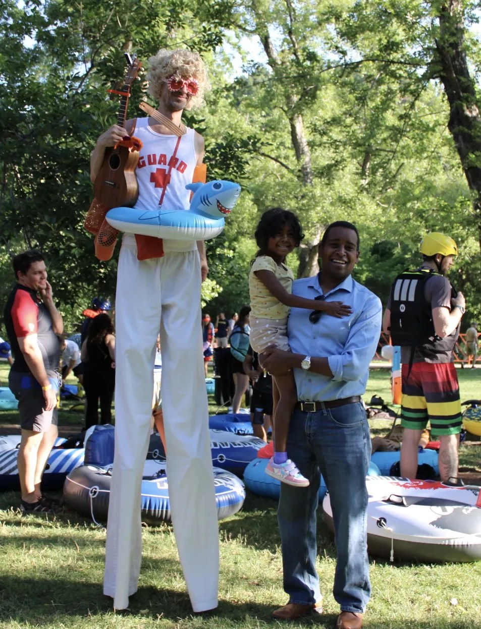 Congressman Joe Neguse and his kid pose with a man on stilts.