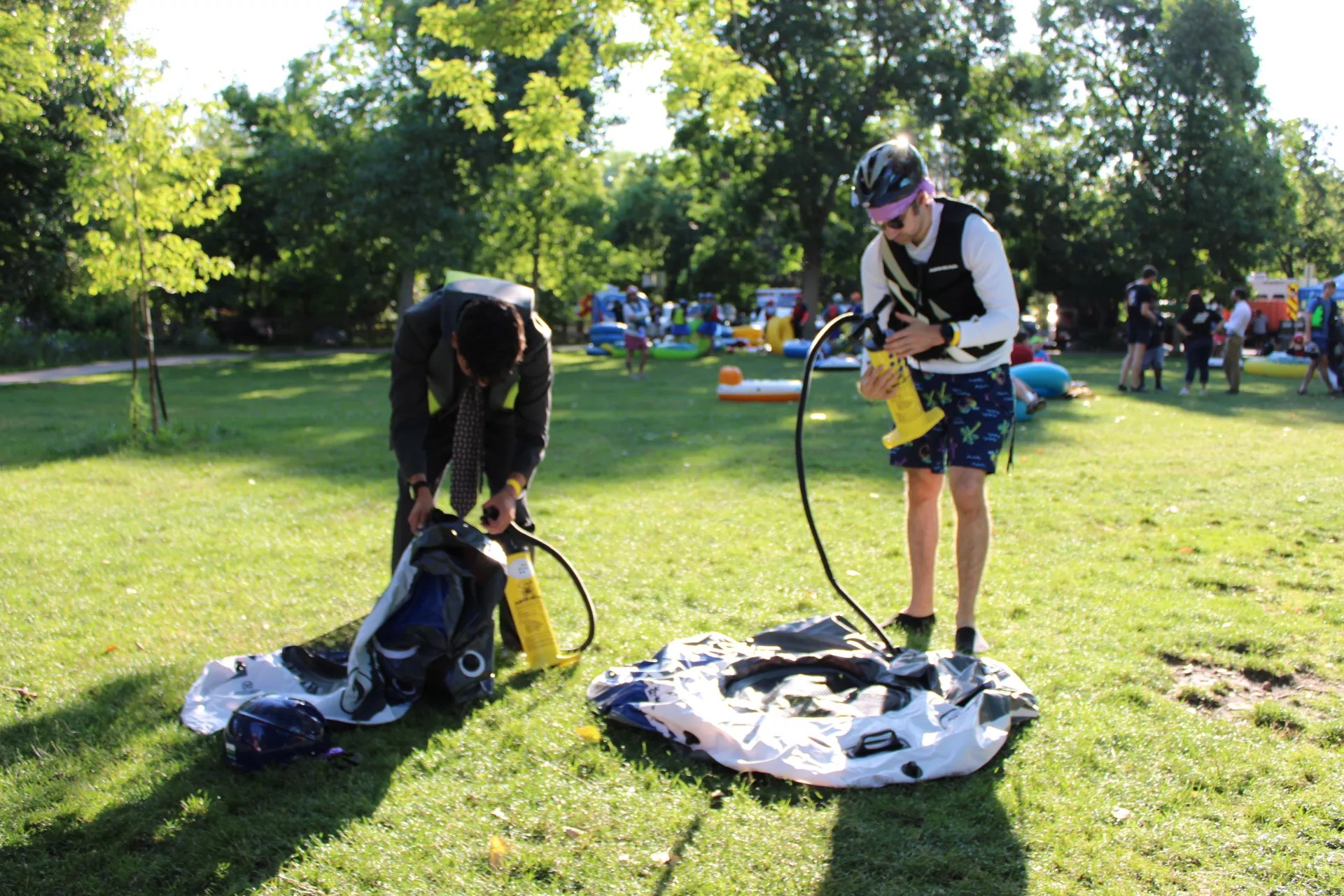 Attendees began trickling into the Eben G. Fine Park around 7 a.m., greeted by games, dancing and a stilt-walker parade. The weather cooperated: clear skies, mid-60s temperatures that rose to the low 70s and no wind made for ideal tubing conditions. First-timers and seasoned veterans mingled as they inflated tubes, zipped wetsuits under their collared shirts and mingled with others about to take the plunge.