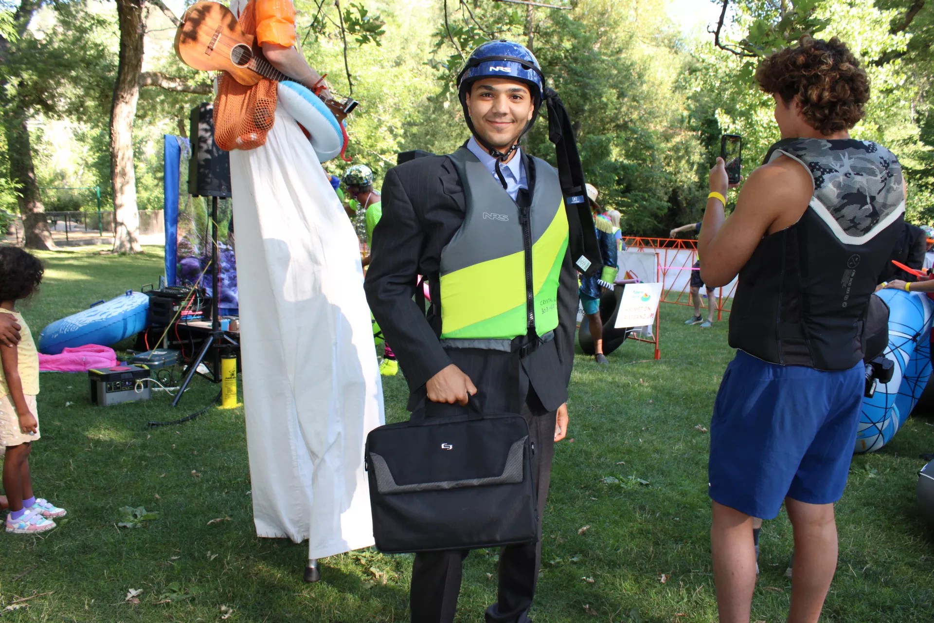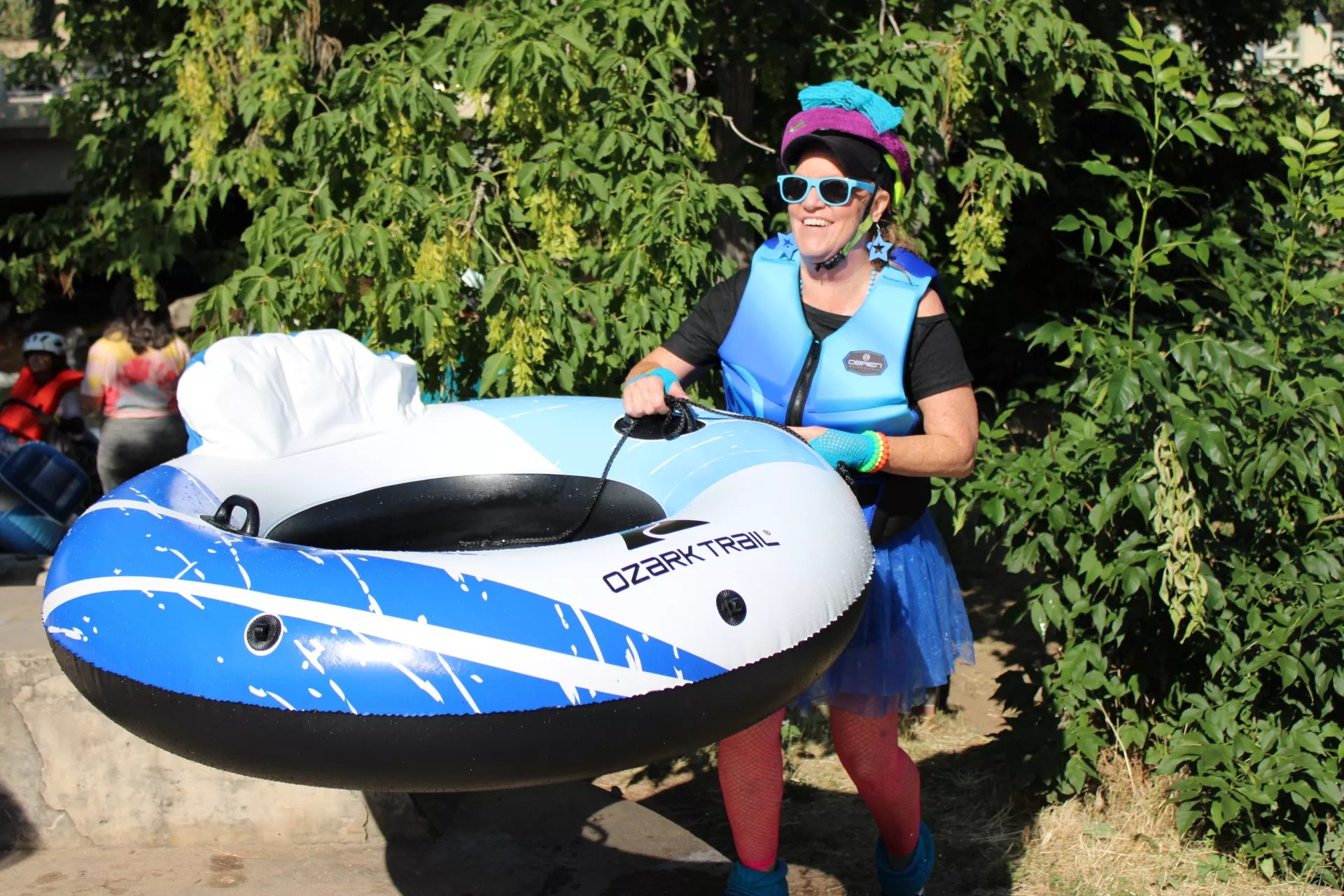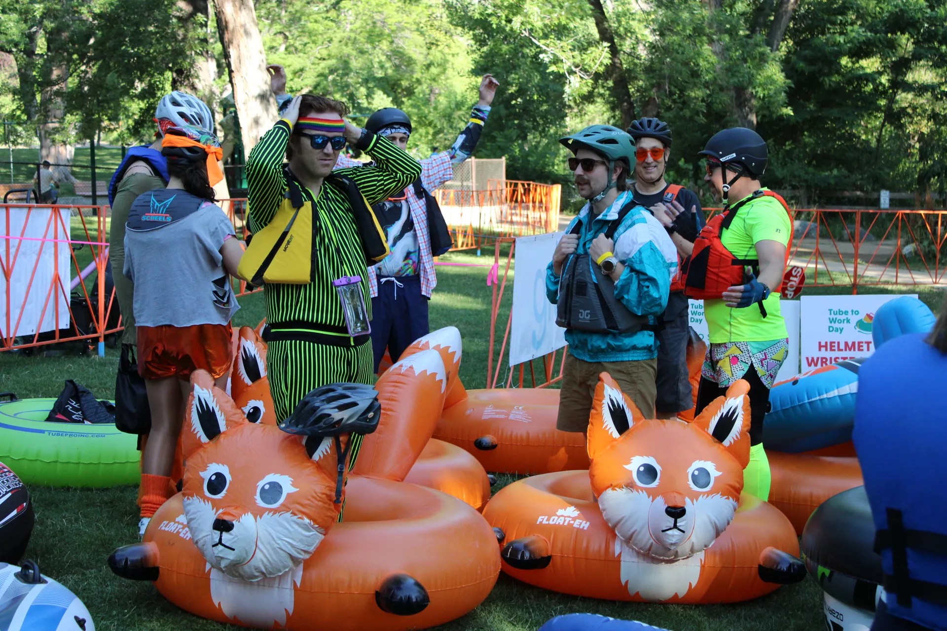 At 8:15 a.m., a ribbon duct-taped to a saw blade was sliced in half by Neguse and Schuchard. With wristbands raised and helmets buckled, waves of tubers launched into the current. Some paddled in sleek river gear; others grinned in dripping button-downs and wacky costumes.