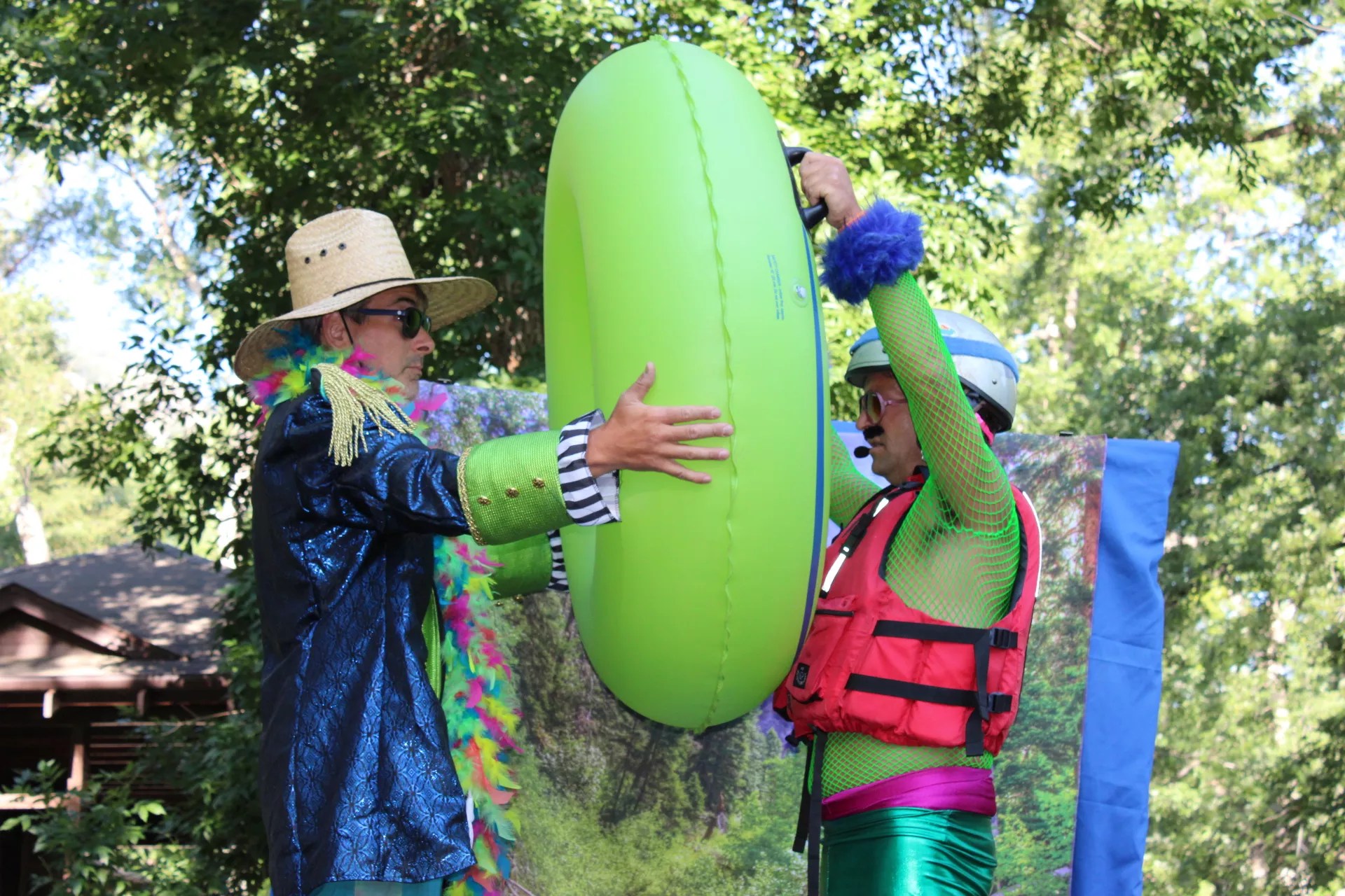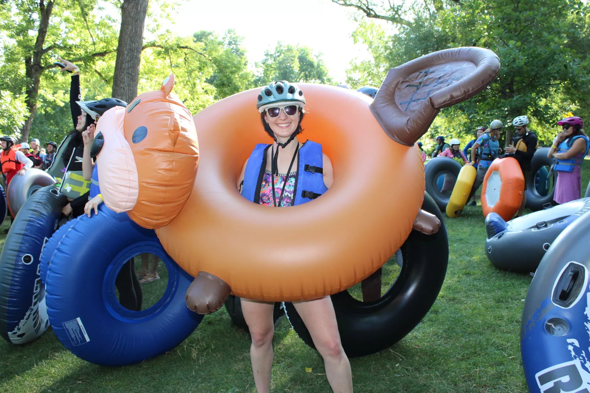 A few lucky participants walked away with prizes before the send-off. This year’s Best Tube awards went to a giant inflatable squirrel and a community of floating foxes. The Best Dressed category honored one tuber in full business attire carrying a laptop and another with a disco helmet, disco ball necklace, green mesh shirt and bright pink shorts and leggings.