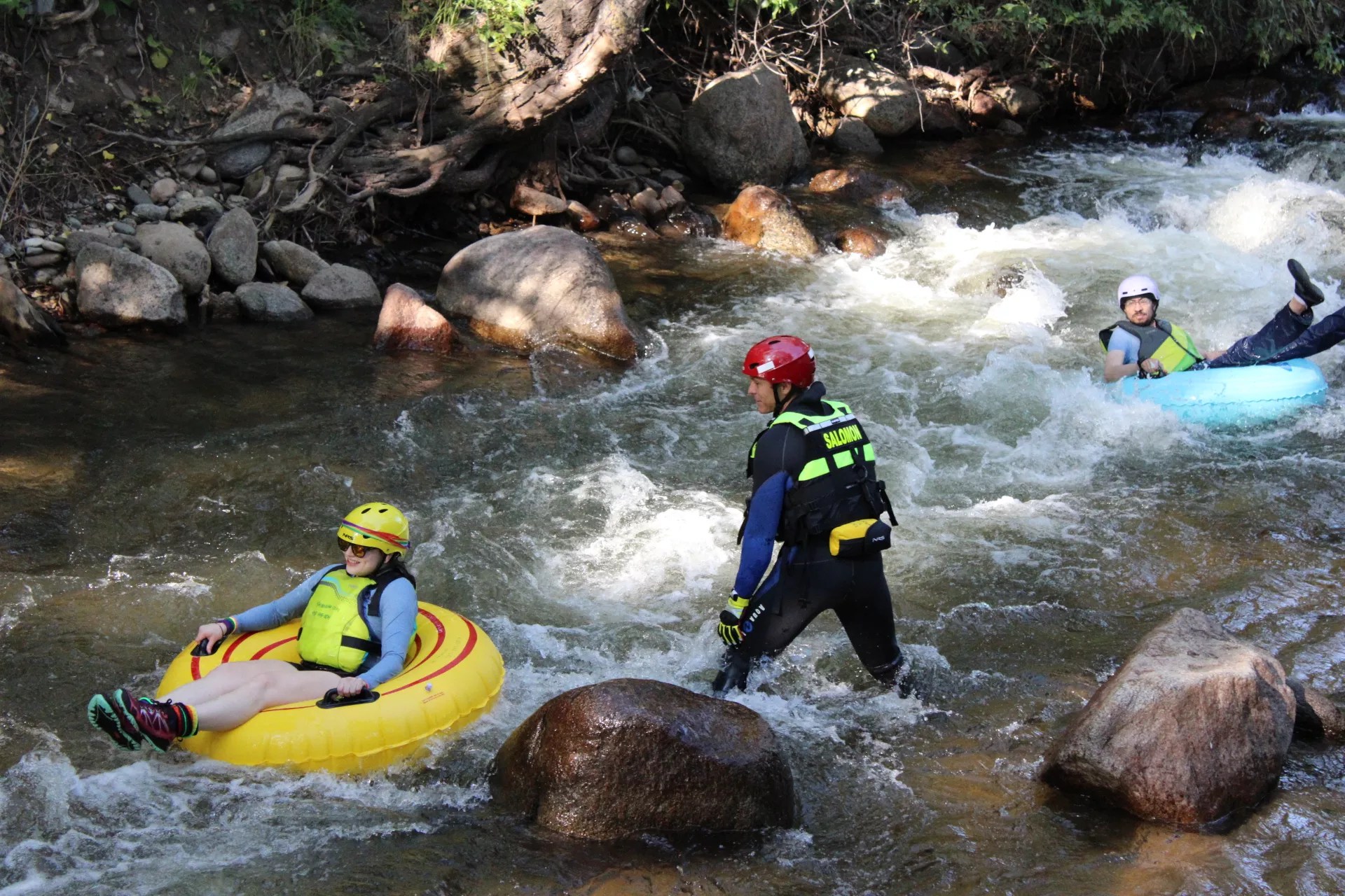 Three people pose with their tubes in a parking lot near Central Park in Boulder before heading to Eben G. Fine Park.