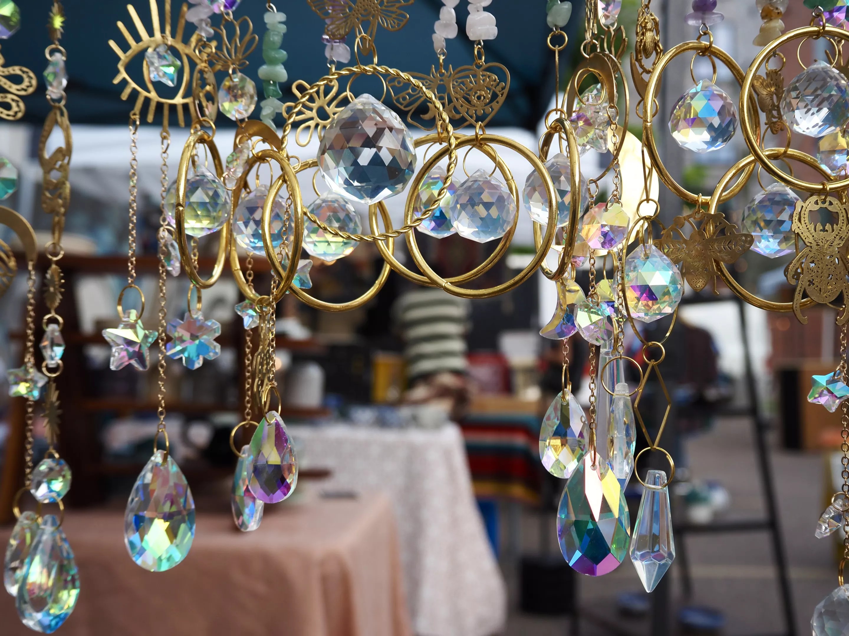 Suncatchers hang from a vendor’s booth at August First Friday.
