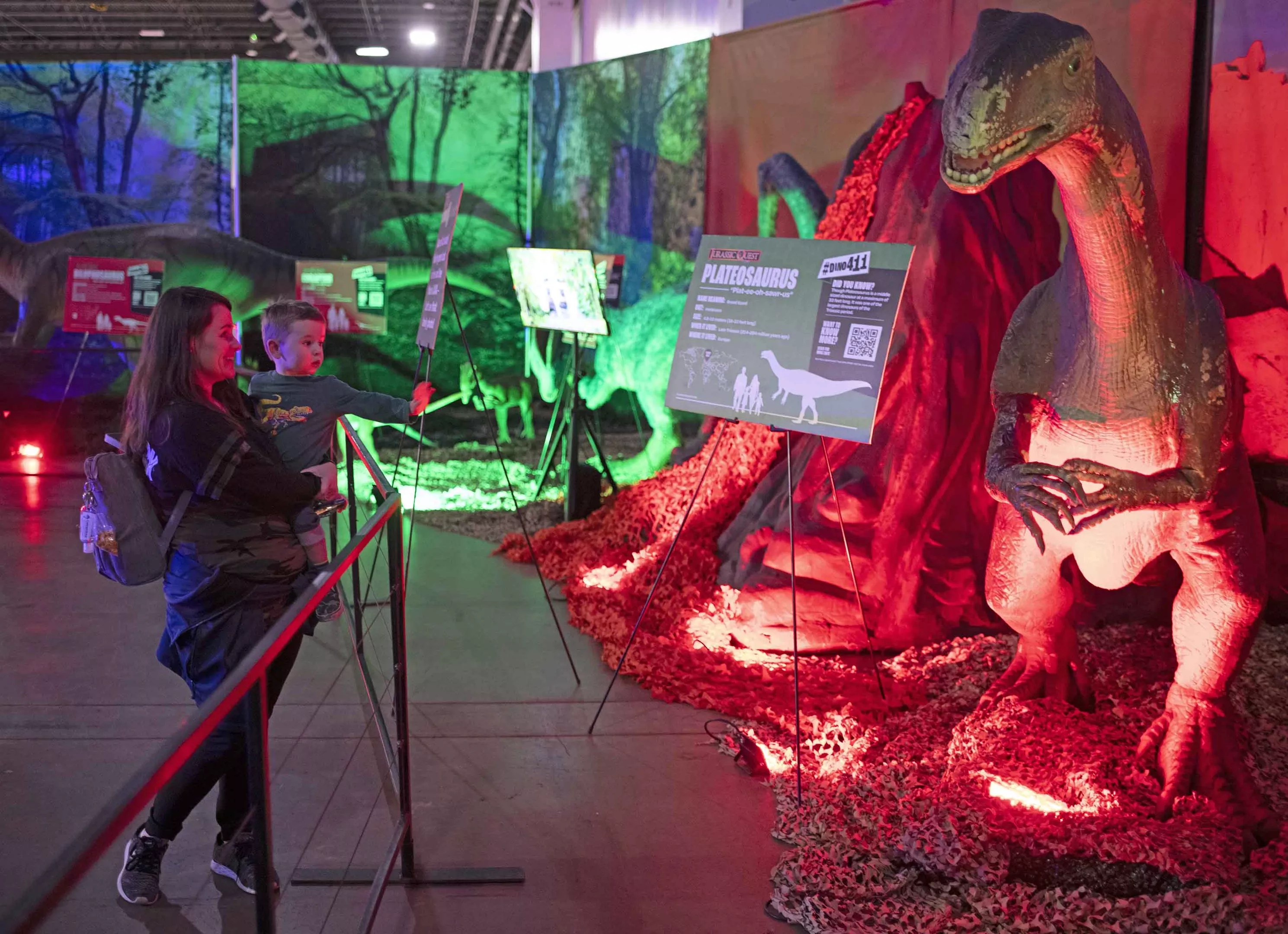 Candice and her two-year-old wave to the Plateosarus.
