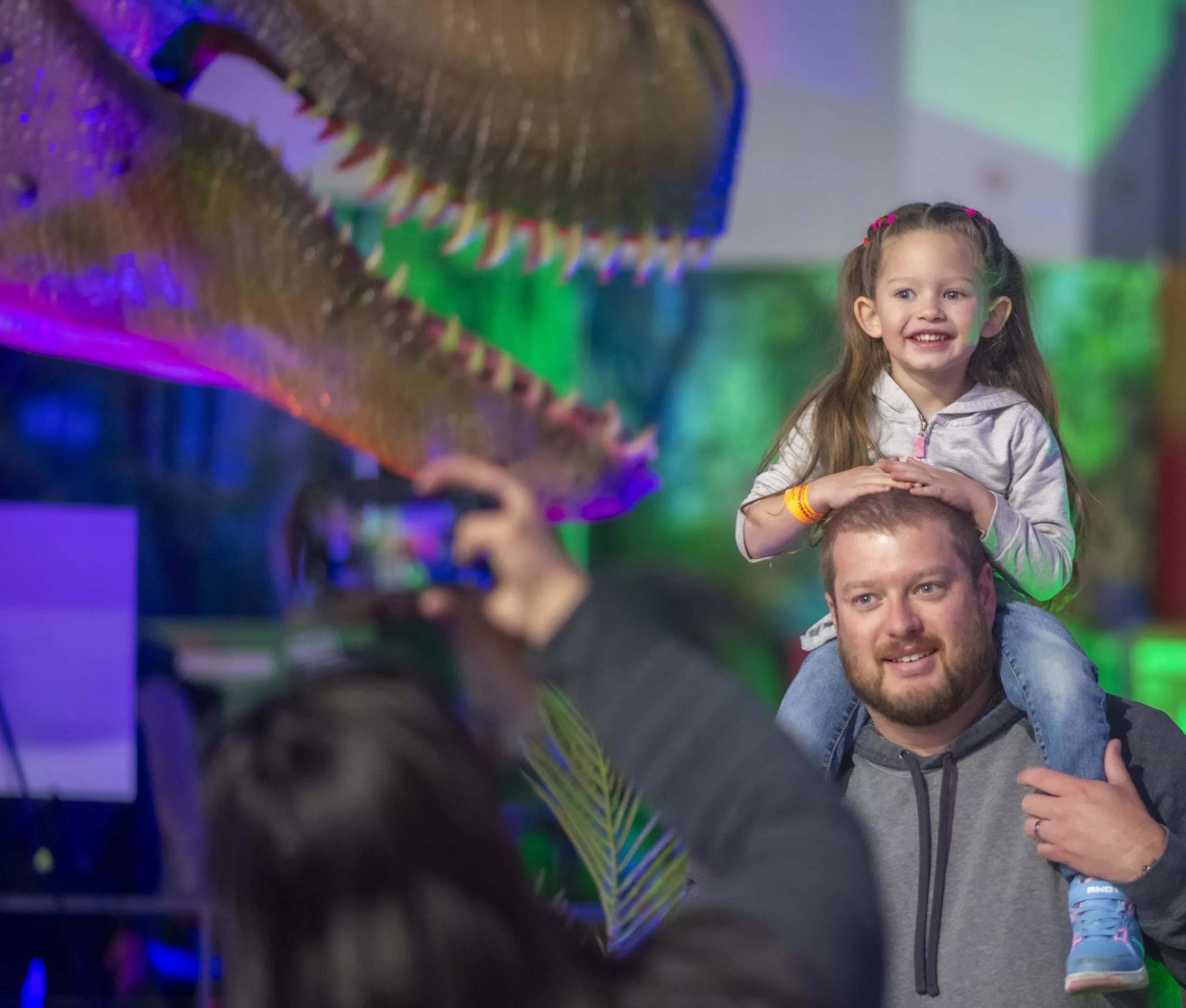 A father’s shoulders provide a perfect viewing platform at Jurassic Quest.