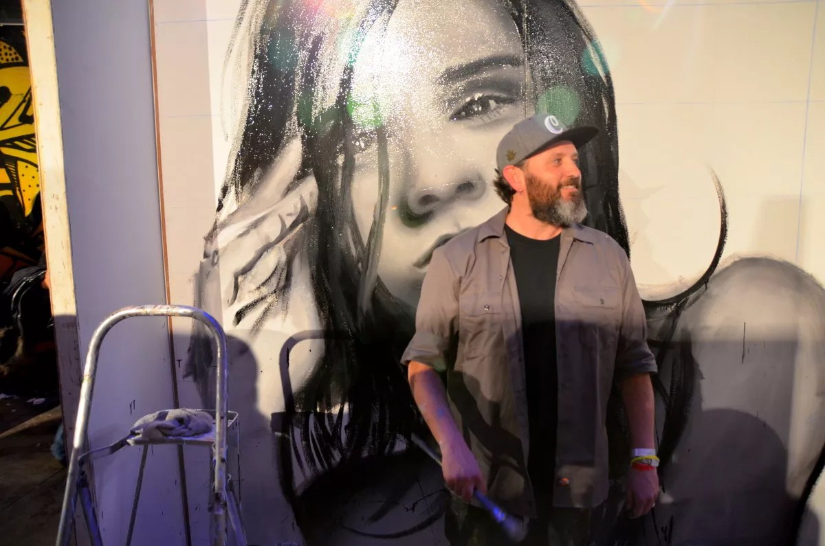 Casey Kawaguchi paints a mural at Artopia 2017.