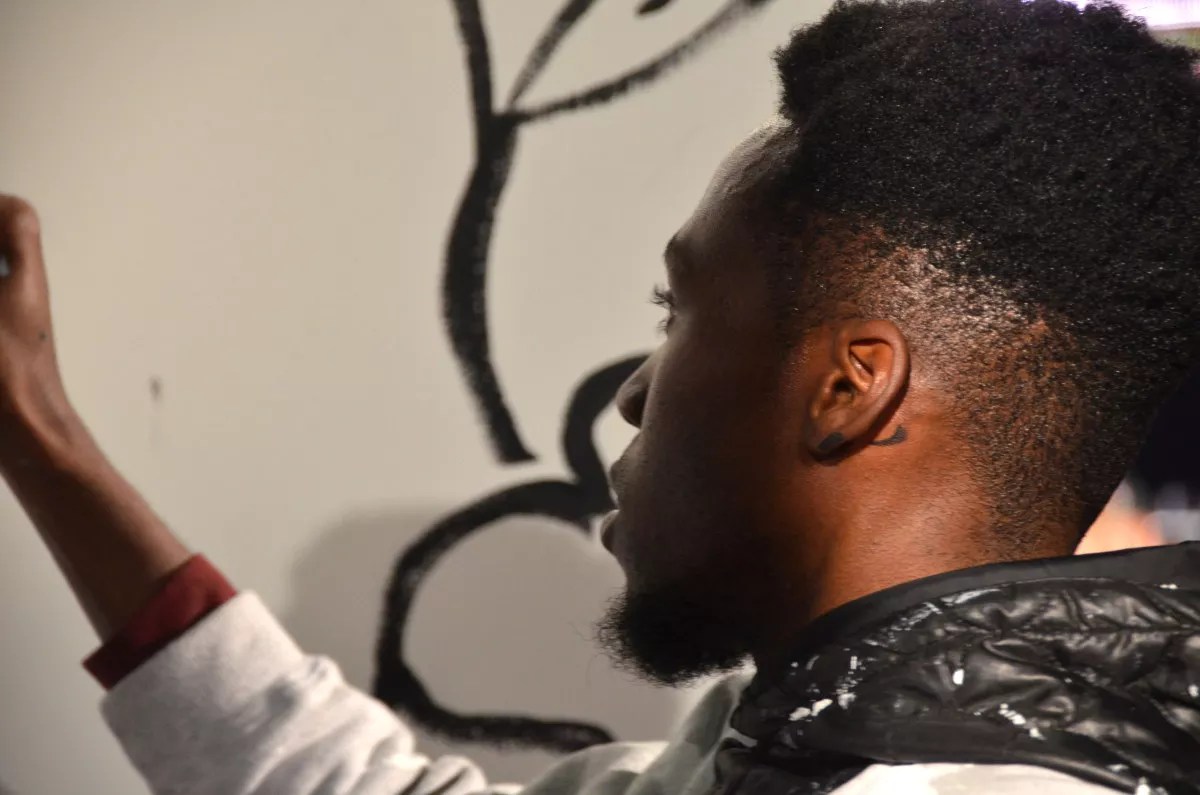 Lionel-Bravo Bumbakini paints at Artopia 2017. The mural was also in collaboration with Jeromie Dorrance and Christian Salgado, both Dateline Gallery artists.