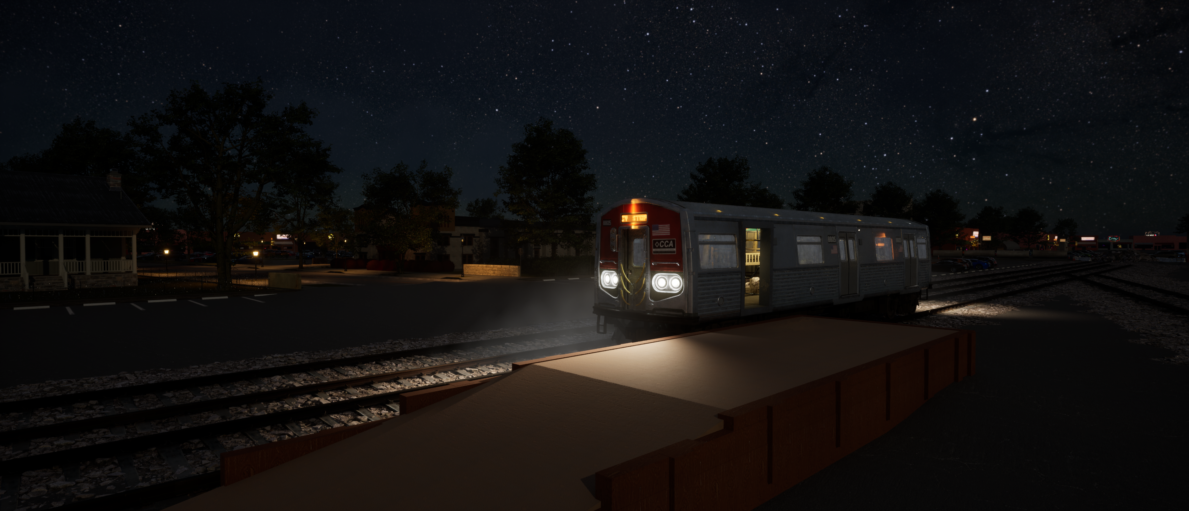 A subway train at night in Anythink World’s Unwritten.