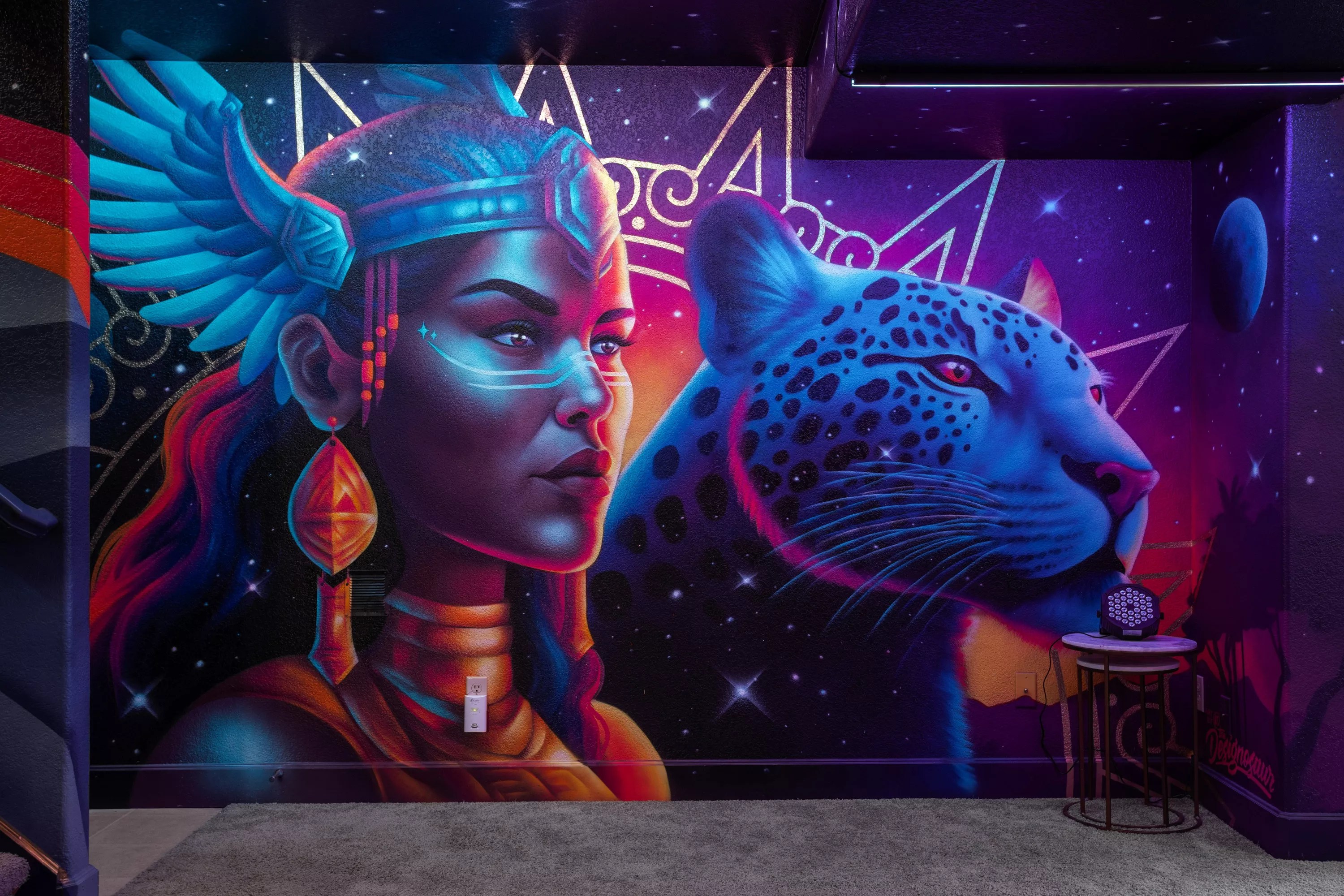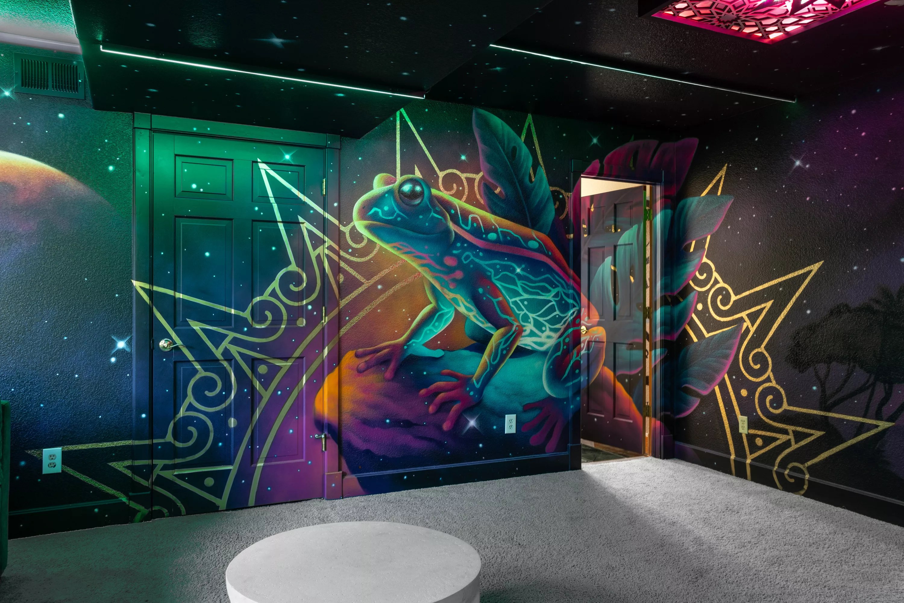 The master bedroom was painted by husband and wife team Lindz and Lamb, local Denver muralists, in their signature “Lambscape” style. The Jungle Room contains a full 360 degrees of jungle-scape, painted by British street artist Klonism. And Italian street artist Galo painted some of his signature characters in the basement bedroom.