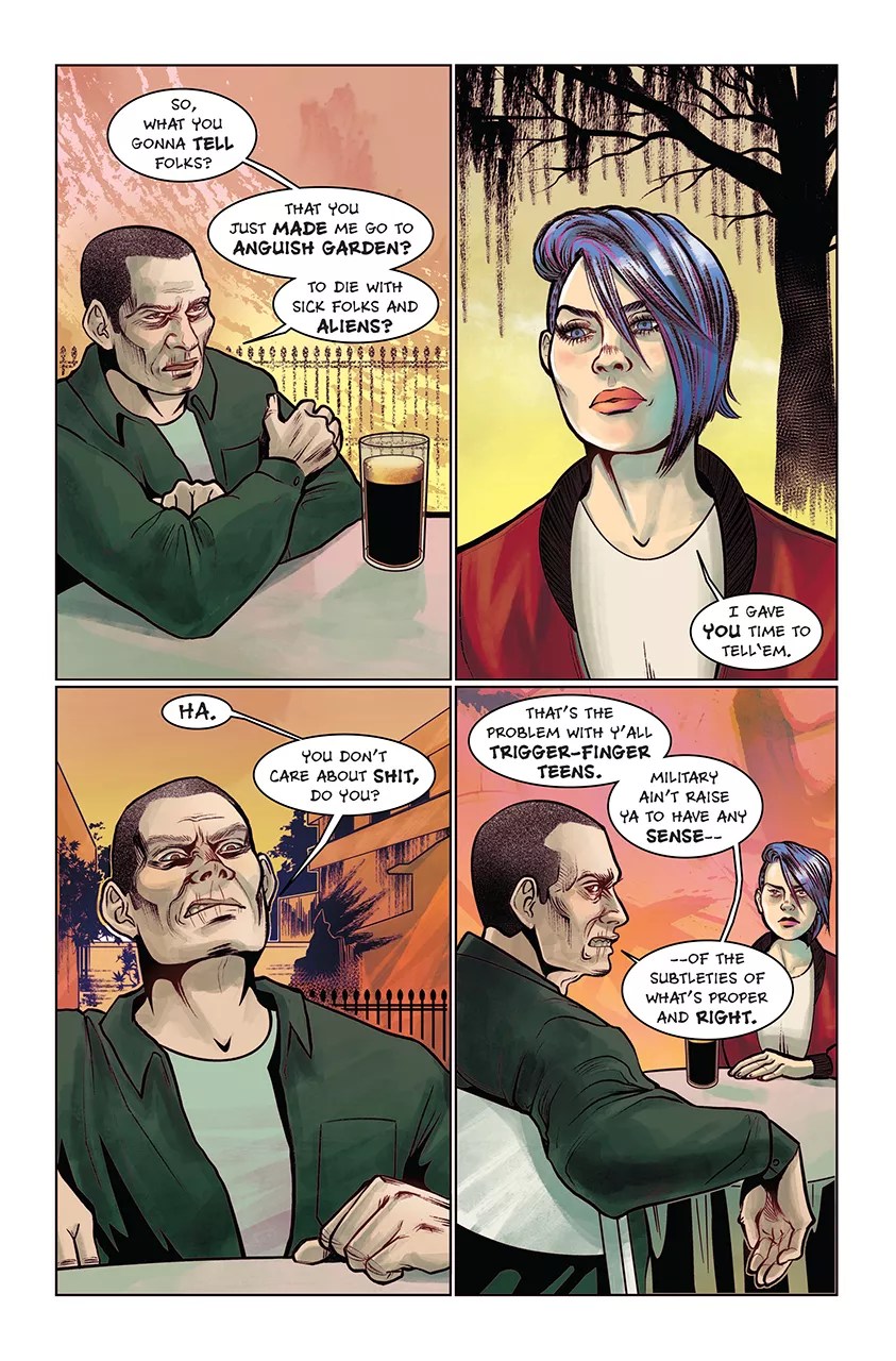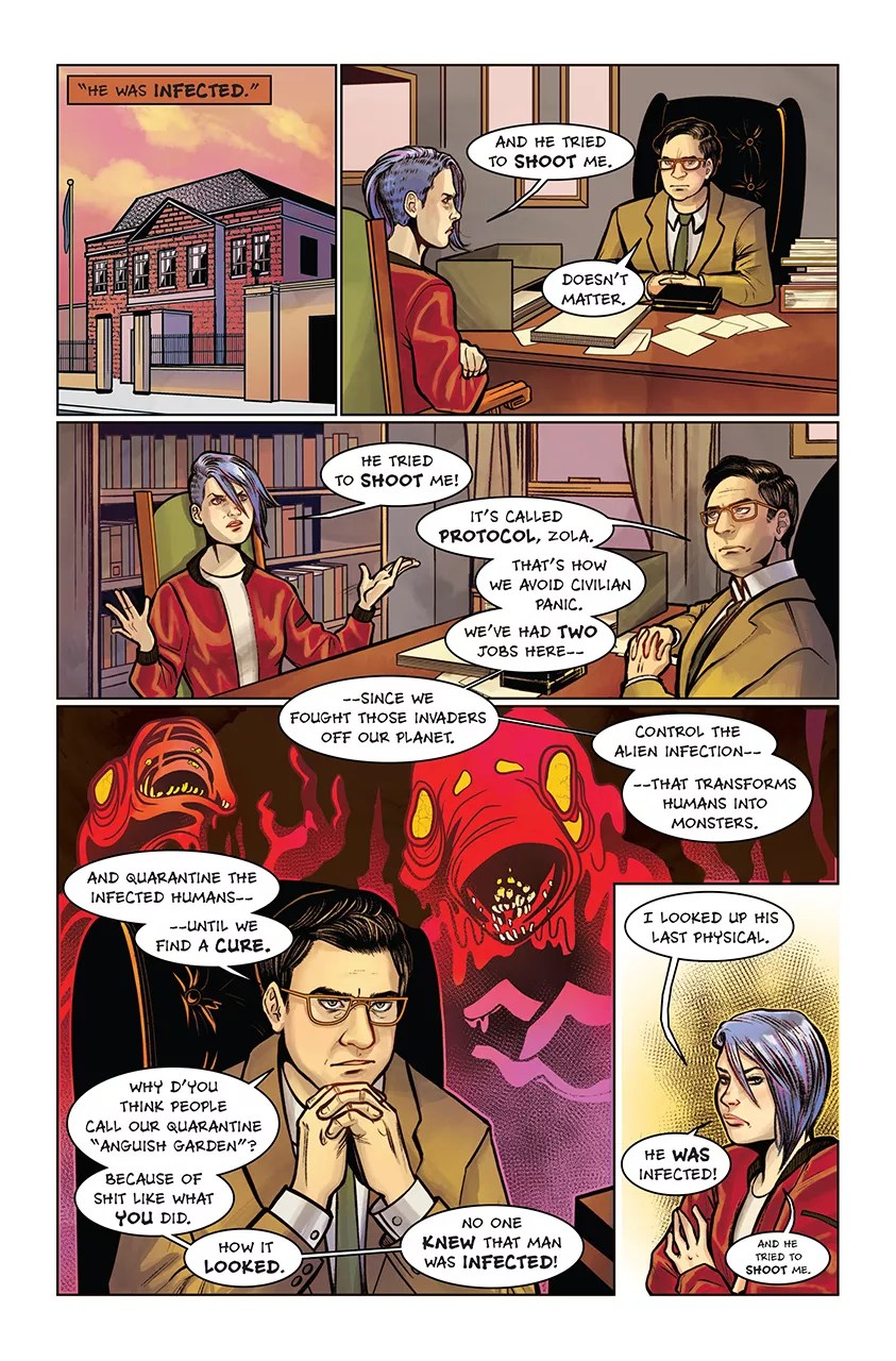 R. Alan Brooks: Anguish Garden parallels the path of someone leaving white supremacy by telling the tale of Zola, a girl who is raised to hate – and hunt – people who she believes to be infected by an alien virus. She thinks that she’s doing something benevolent by hunting down infected people, as she considers them a danger to humanity. She’s trying to be heroic but is misled, so she eventually finds her beliefs challenged, particularly about whether these people actually pose any threat.