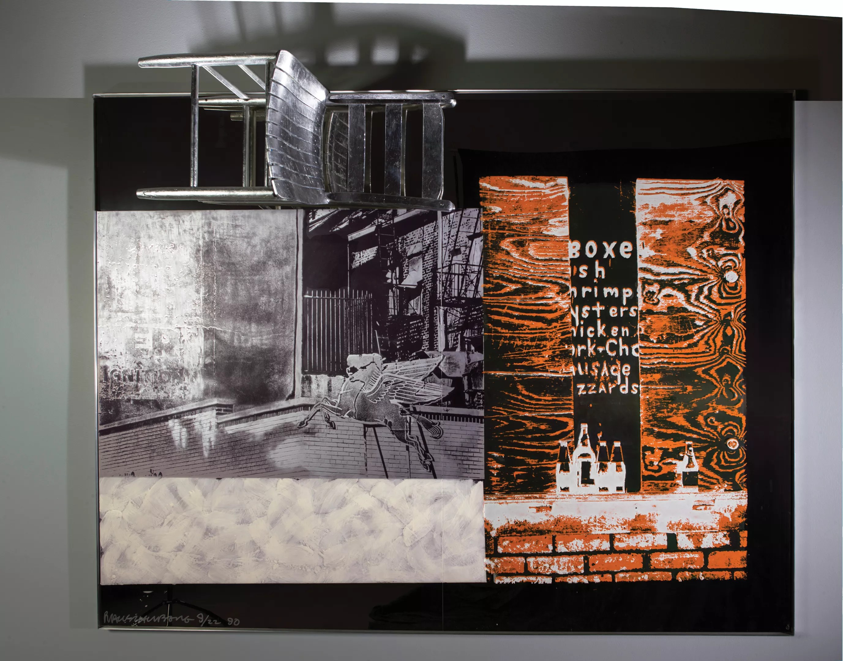 Though also done in metal, the pieces made of sheets of mirror-finished stainless steel have a very different aura. A masterpiece of this type is “Pegasits,” done in 1990 and one of Rauschenberg’s favorites from that time. The imagery includes a photo transfer of the Mobil Oil symbol, the Pegasus tiled with other photo transfers of wood grain, text, bricks and industrial facilities; at the top left is an aluminum cast of an old chair. This three-dimensional element footnotes one of Rauschenberg’s chief claims to fame, the combine painting, in which sculptural elements are appended to paintings.