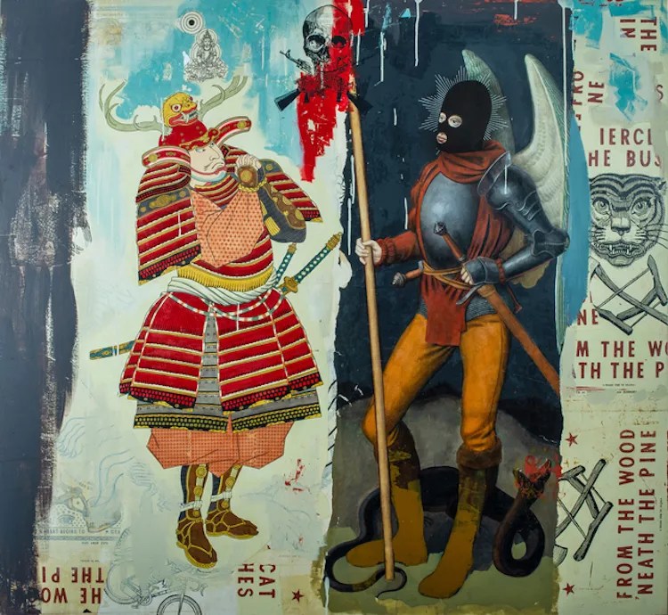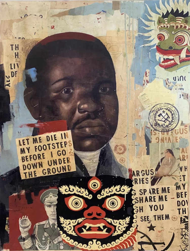 “The main subject of this piece was painted from an old renaissance piece of a dutch emissary to the Congo. I don’t know anything about the man, I just loved the painting and wanted to recreate it. If you scroll, you can see the original that I was looking at when I painted it. Also on the piece is a drawing of Vasili Arkhipov, a Soviet submarine captain who, during the Cold War, blocked an order that would have started World War III. The text comes from a Bob Dylan song which lamented the American trend of making home bomb shelters during the Cold War.”