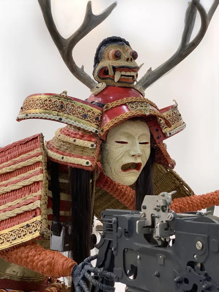 Ravi Zupa, mixed-media samurai sculpture with machine gun.