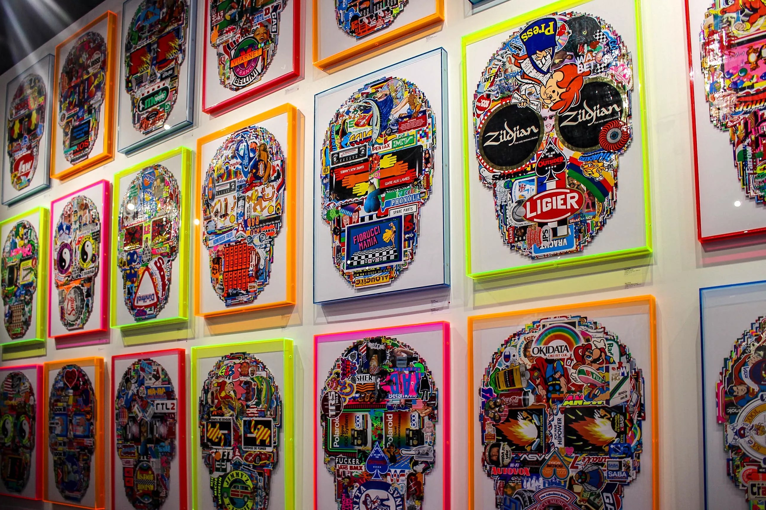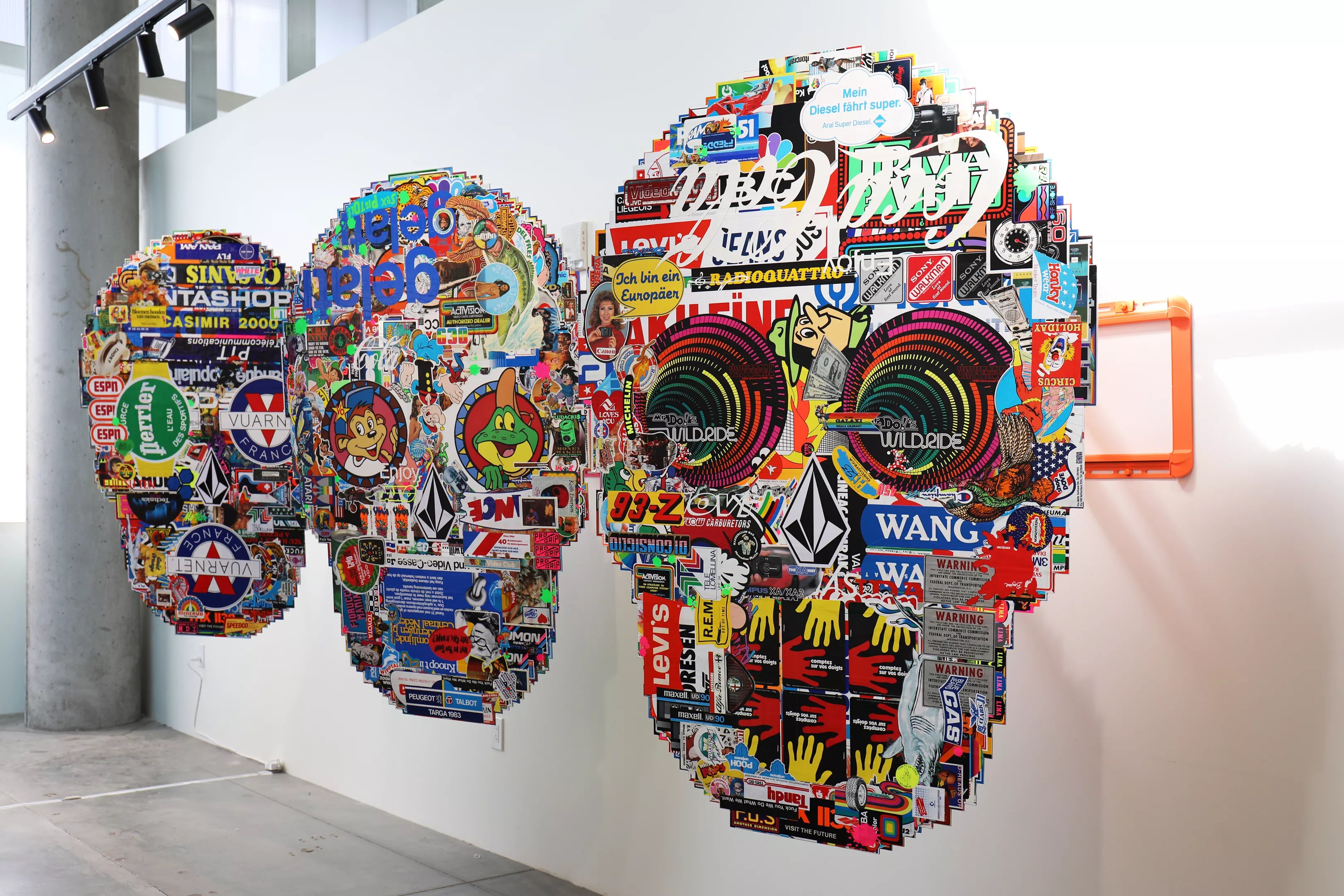 He builds his complex “collages” from layers and layers of vintage stickers from around the world (most are between ten and thirty years old), plastering them into simple, repeated, pixelated skull shapes with heavy, textured surfaces. If not for the overlapping lines of text, the shifting patterns of darks and lights might look like paintings if you squint. Though it’s easy to get lost in the details, the repetitive outer shapes create a strong impact when the works are hung in a grid, which visually connects them to the pixelated 8-bit video games that debuted around the same time that so many of these stickers did.