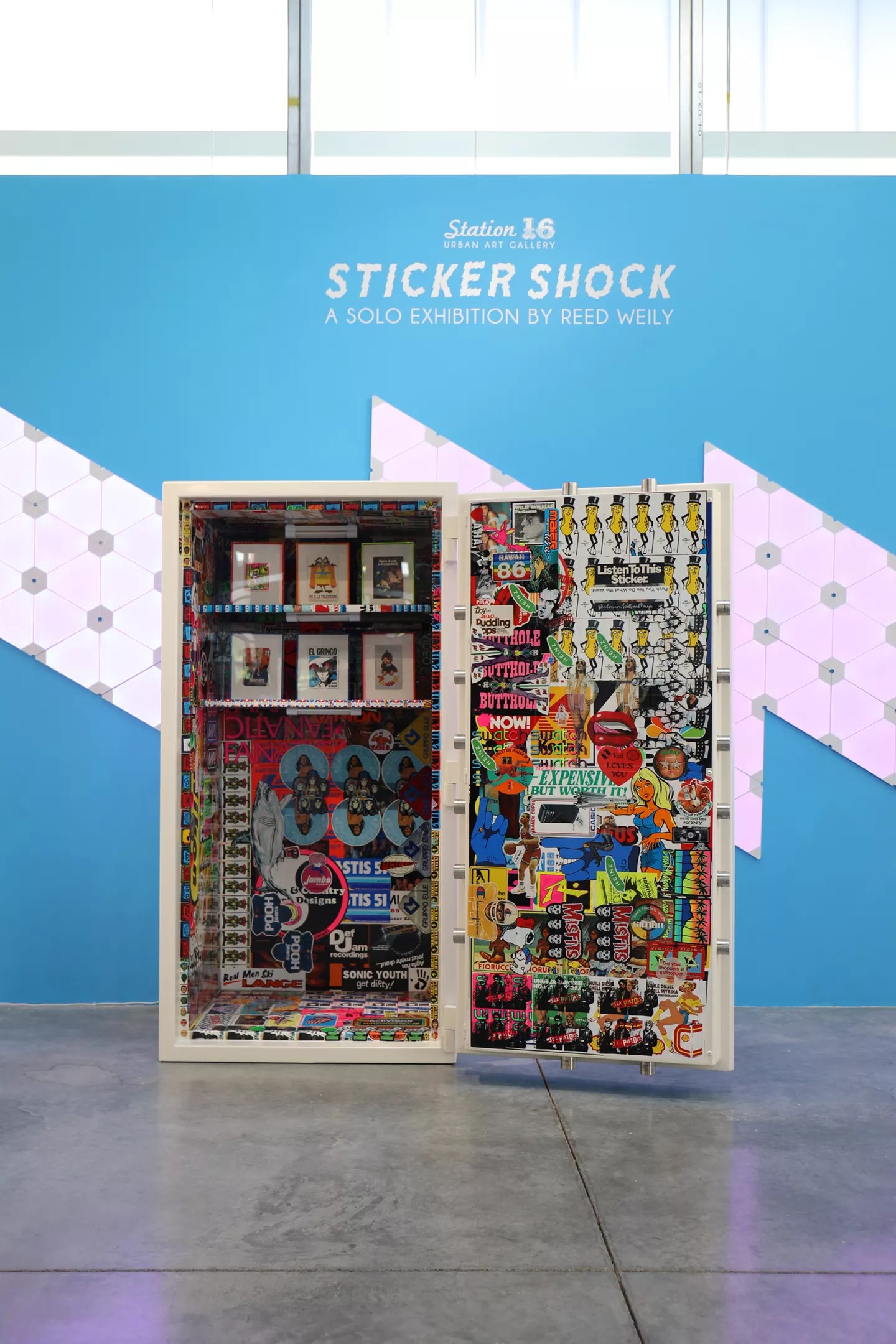 That punk, wallpapered aesthetic is all over Sticker Shock, at Station 16 at the Source Hotel, 3330 Brighton Boulevard, where Reed Weily, an immigration lawyer turned artist, is having his debut art show. Weily’s first love was collecting vintage T-shirts, a hobby that morphed into collecting stickers and later into making art with them.