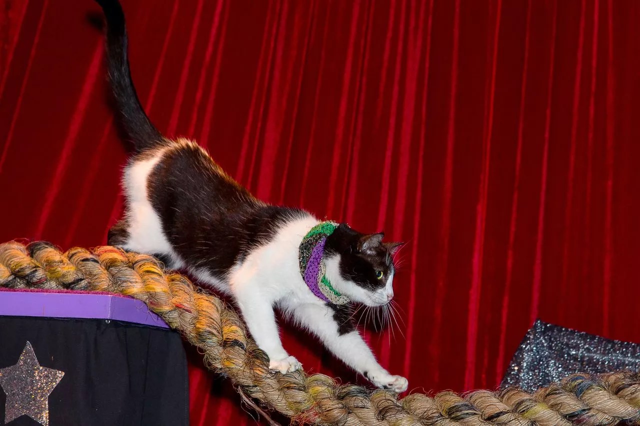 The final act is Tuna and the Rock Cats, billed as the only all-feline band in the world. Each cat is placed in front of an instrument, like a guitar, drums or piano, and either paws at it or gets treats strategically placed in the mouthpieces, as was the case with the new Jazz Cats on trumpet and clarinet. Sound effects are overlaid for comedic effect, like a saxophone solo timed with the cat “playing” Careless Whisper.