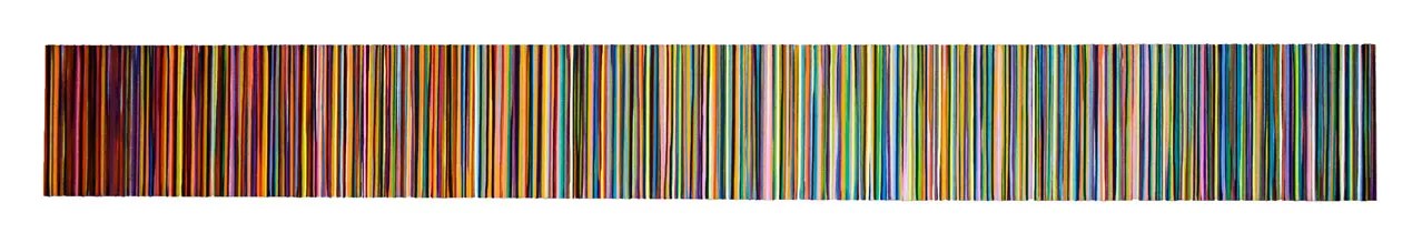 In an alcove between the Karolak and McNeil shows is the last and by far the smallest of the eight interlinked solos, Wendi Harford. There are only two paintings here: “Blue Streak II” and “It’s the Little Things.” But since they are so tall – seven feet and thirteen feet, respectively – they make a strong enough statement to stand up to the other seven shows. Harford displays different kinds of abstraction in these particular paintings, which are from a body of work in which she uses drips of paint to form controlled stripes. The repeated pattern of the stripes, executed not with tapes or rulers but with freely flowing drips of pigment, makes these paintings an intersection of gesture and geometry – a decidedly unusual combo.