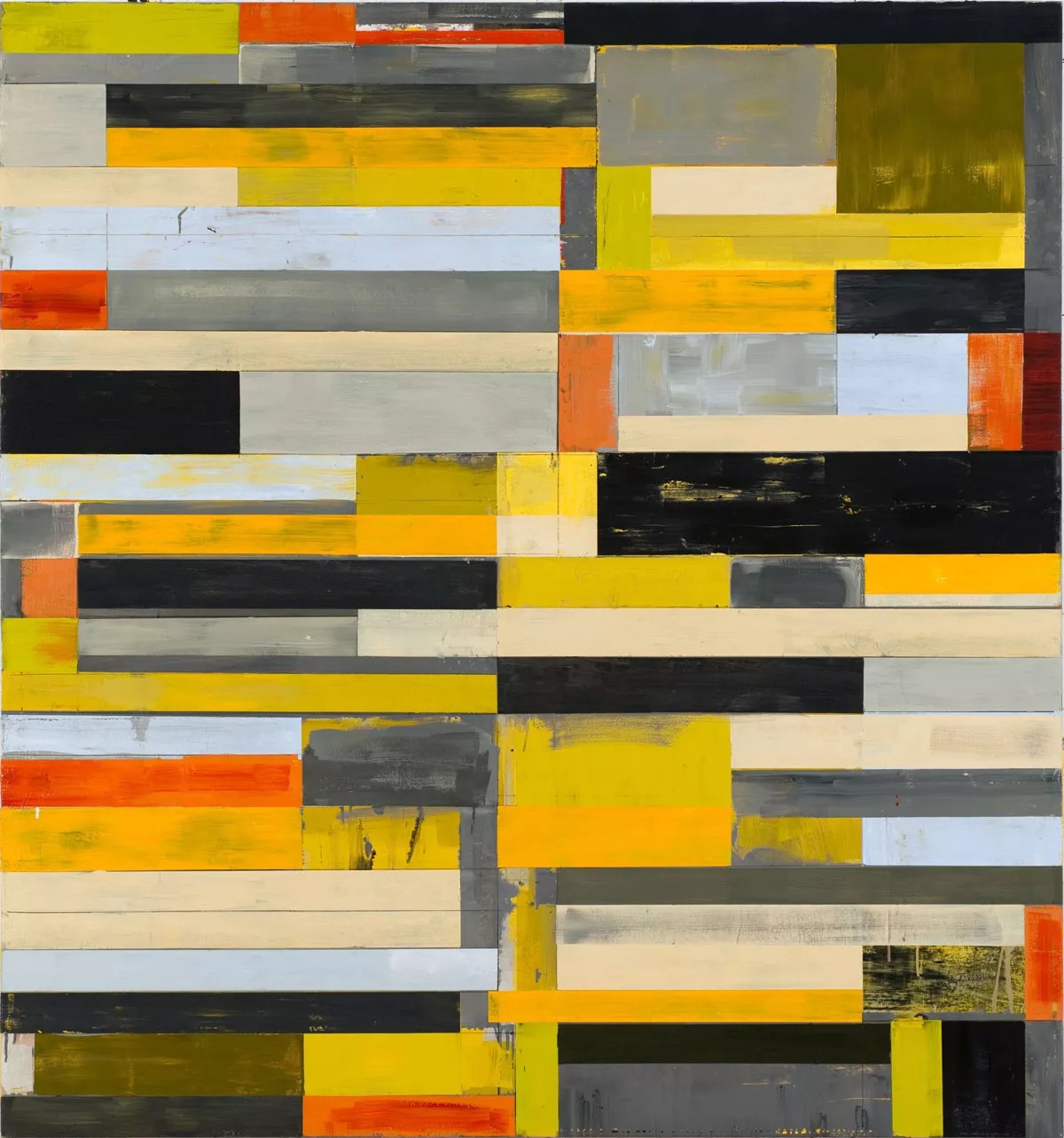Back in the viewing room, Lloyd Martin highlights another artist who, like Westfall and Voisine, is interested in architectonic compositions. In Martin’s paintings, horizontal bars are the chief formal device; this has been the artist’s signature for the past five years. Martin adds an expressive, painterly aspect to the mix of geometric shapes and straight lines, and his stacked rectilinear shapes are painted and repainted with gauzy layers of pigments, allowing the earlier coats to show through in areas and lending the bars a scuffed-looking quality. The rhythm of the colors of the rectilinear shapes creates different compositional approaches; some have a clearly articulated formal structure in the center, while others have an all-over quality.