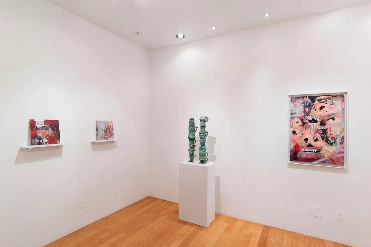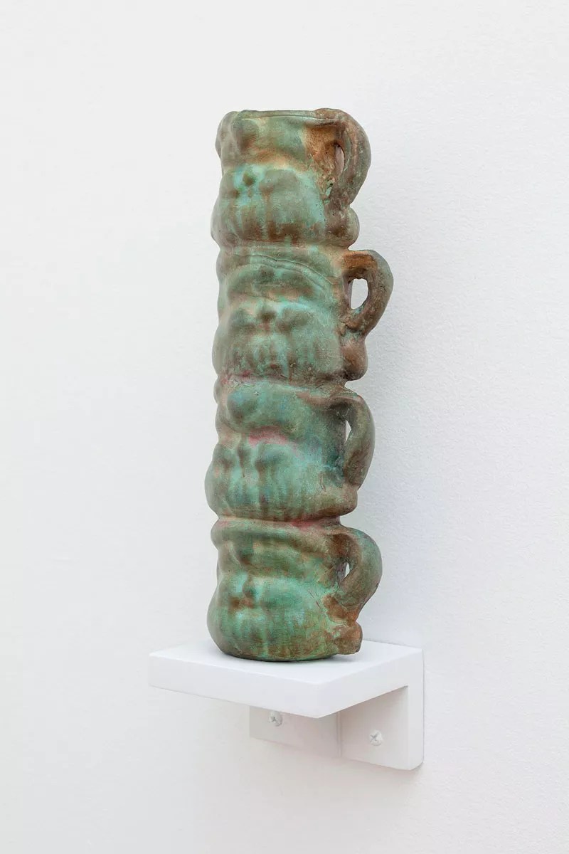 Donald Fodness: Duets, a separate show in the experimental space, displays a funky mashup of abstraction, surrealism, pop and kitsch. Several of the wall pieces involve altered ready-made images; Fodness adds to and subtracts from the original sources. He pushes the concept even further in his memorable small bronzes. For “Mr. and Mrs. Manyheads,” a pair of compact totems, Fodness has stacked found face mugs and cast them in bronze, then covered them in a gorgeous verdigris patina. It’s a clear example of his longstanding interest in merging lowbrow and highbrow aesthetics – and that merger works really well here.