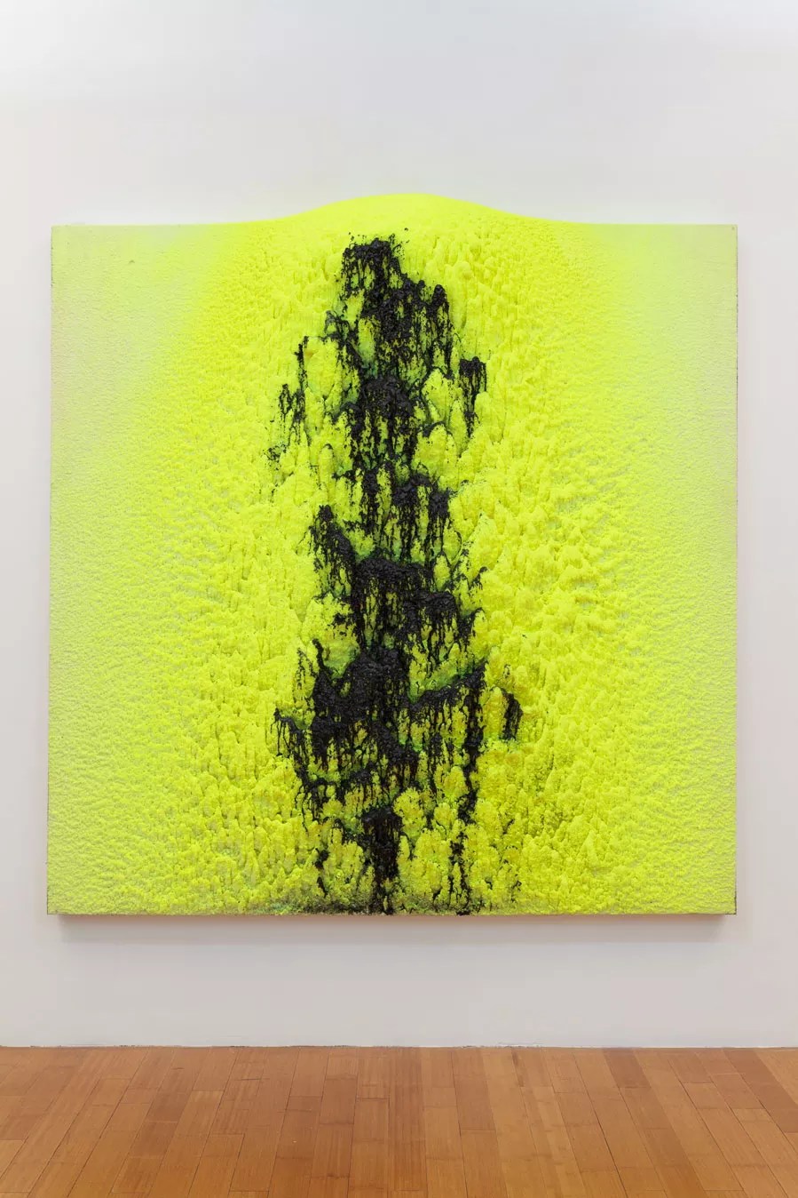 The Gebbia-Richards paintings are large; the two biggest ones measure seven feet square. Gebbia-Richards also employs an unusual method: He applies colored waxes with an industrial blower, building up the wax in coats to form tiny repeated spires that come up high off the surfaces. In “In Night,” a lighter-colored passage descends into a darker ground that envelops it; the colors used are complex, with different shades appearing on different levels. More graphic is “Fall From Grace,” in which a splattered black shape rises through a light-colored ground. In many ways, these paintings recall abstract expressionism, but Gebbia-Richards puts a new spin on the old style.