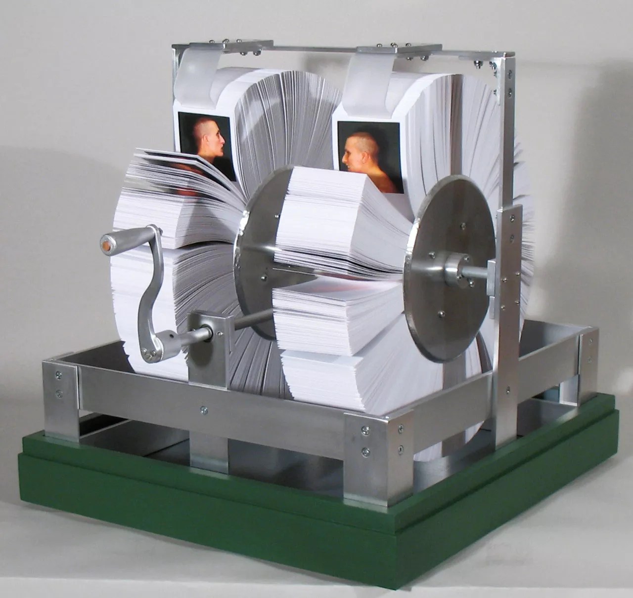 The show in the enormous lower-level galleries begins with a series of lyrical, photo-based collages by Heidi Neubauer-Winterburn from her recent “The Universe” series, in which she imposes cut-outs of historic images, including those of the figure, on top of other images. These collages bracket a video projection with parts surgically removed, but with subtitles that tell a real-life story of a family committing suicide. On the opposite side of the entry is an enigmatic video and accompanying photos by Chrissy Espinoza that record a performance in which a man goes into the wilderness with a shovel, disrobes, buries his clothing, digs it up and puts it back on; the pointlessness of the exercise harks back to the neo-dada videos of the ’60s. In between is one of Dave Seiler’s updated, hand-cranked animation machines that he calls phrenitiscopes; this one is beautifully made with clear acrylic sheets and shiny metal. The viewer turns a handle to flip photo cards arranged so that they simulate movement when the wheels of images get going. There’s also a heavily censored Seiler video that’s nothing more than big blocks of color moving on the screen.