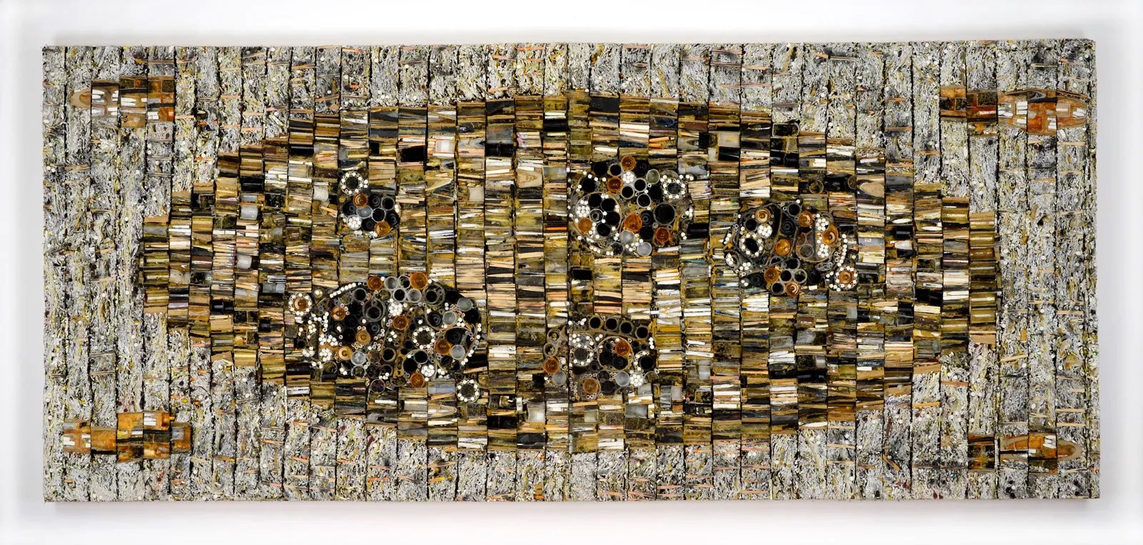 The exhibit’s showstopper is the monumental wall sculpture “Job’s Lament.” In this horizontal diptych, Maker has used saw-cut aggregated paper and paint to convey a multi-colored hill rising from left to right, set against the sky. In a non-repeating pattern across the panels, she has affixed variously sized capsules.