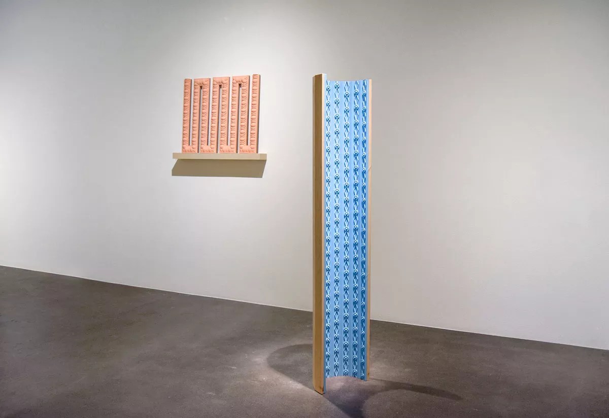 Other Velasquez pieces here seem to pick up where those at MCA Denver leave off, including a handful of works from his “Preservation of the Monument” series, which are closely aligned with his gold-molding installation in the MCA atrium. Though it could be argued that Velasquez’s form-finding vinyl works are architectonic because they’re based on tensile concepts, his interest in buildings is even more clearly expressed in these works, which employ cheap, ready-made cast moldings whose original purpose was to add a tawdry, ersatz traditionalism to a building. In “Imperfect Future,” Velasquez has created a Greek key pattern out of the molding that runs across the floor; a similar pattern is used for “Ultimate Trace,” a wall-mounted sculpture. But the tour de force of the “Preservation of the Monument” pieces is “Tall Field,” a wooden column with the moldings, painted bright blue, lined up vertically inside the concave interior of the column.