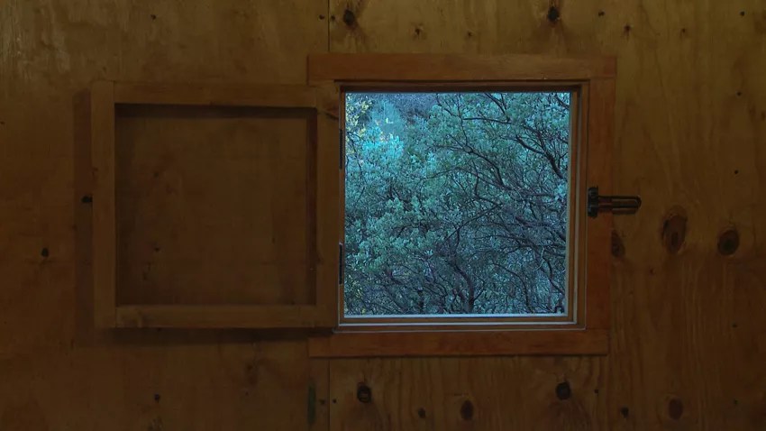 Detail of “Two Cabins,” by James Benning, two-channel HD video.
