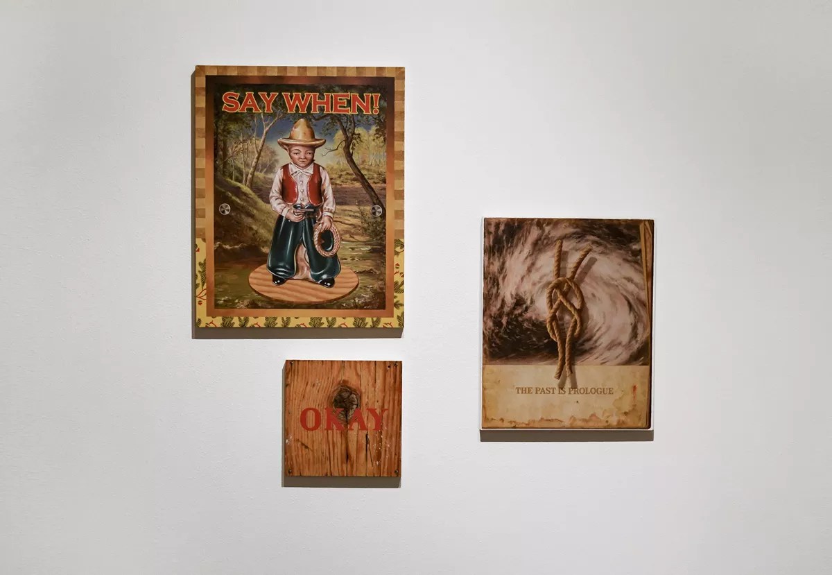From the Judds, it’s just a hop, skip and a jump to the next solo, Jerry Kunkel: RECON TEXT, dedicated to another painter who looks back at familiar sources for inspiration. Kunkel spent thirty years teaching art at the University of Colorado Boulder; he retired a dozen years ago and moved to Lawrence, Kansas. A hyperrealist with an unusual taste in subject matter, Kunkel mines the history of art and the history of kitsch with equal rigor, sometimes bringing both together in the same painting. In “The Male Gaze With Squirrel Figurine,” for instance, Kunkel depicts with fanatical accuracy a mass-produced reproduction of an academic painting of an artist at his easel. Looking closely, you can see that the print has been rendered as if it were thumbtacked to a wall. Kunkel has embellished the scene in a number of ways; in addition to the squirrel in the foreground, the image the artist is painting has been replaced by a full-figure rendition of Popeye. Kunkel is also a master of trompe l’oeil, and you’d swear that his “Name Image, Say Word” is simply a chunk of knotty pine with the word “OKAY” stenciled across it in red instead of what it actually is: a meticulously painted facsimile of the board and painted word.