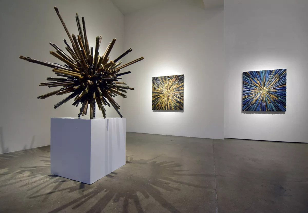 While it’s possible to link the Judd, Kunkel and Winograde solos, it’s a bigger leap to get to Terry Maker: Point Blank. It’s hard to say what these works are really about, but guns, and the implied American fascination with them, is a formal element in several. For these pieces, Maker has cast guns out of polyurethane foam and assembled the casts in a variety of ways. In one ball-shaped sculpture, foam rifle barrels radiate out from the center. In another, pistols are embedded into a ground made of rigid foam comprising casts of rifle barrels that converge in the middle. Both the pistol and the rifle used as masters for the molds have an Old West look, picking up one thin connecting line to Judd, Kunkel and Winograde. Maker also uses casts of little bombs that are kind of kitsch, creating another bridge to those artists. While the Makers don’t seem to be about gun control – not directly – they continue her longstanding interest in recasting ordinary things into extraordinary artworks.