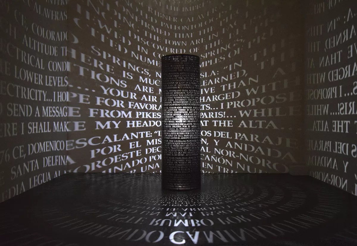The last of the five, Jim Sanborn: Meridian, is coming from someplace else entirely – though there is an American connection with this Washington D.C.-based artist, who’s made a career of being preoccupied with the federal government. Sanborn’s initial national claim to fame was “Kryptos,” which he made for the grounds of CIA headquarters in the 1980s: a serpentine wall made from a thick sheet of copper pierced with letters that formed an indecipherable code. The installation at Robischon, “Meridian II,” is a direct heir to that piece and a slightly smaller sibling to “Meridian,” installed just a few blocks from the gallery outside of Union Station. These similar sculptures each comprise a bronze cylinder standing on its end, pierced with individual letters that form a text that’s difficult, if not impossible, to read; the cylinder is lighted internally so that the words are projected onto anything around it. At Union Station, this feature is only visible at night, and much of it is reflected onto the pavement, but at Robischon the riot of words sprays out from the column in all directions – onto the floor, ceiling and walls, making it a completely immersive experience.