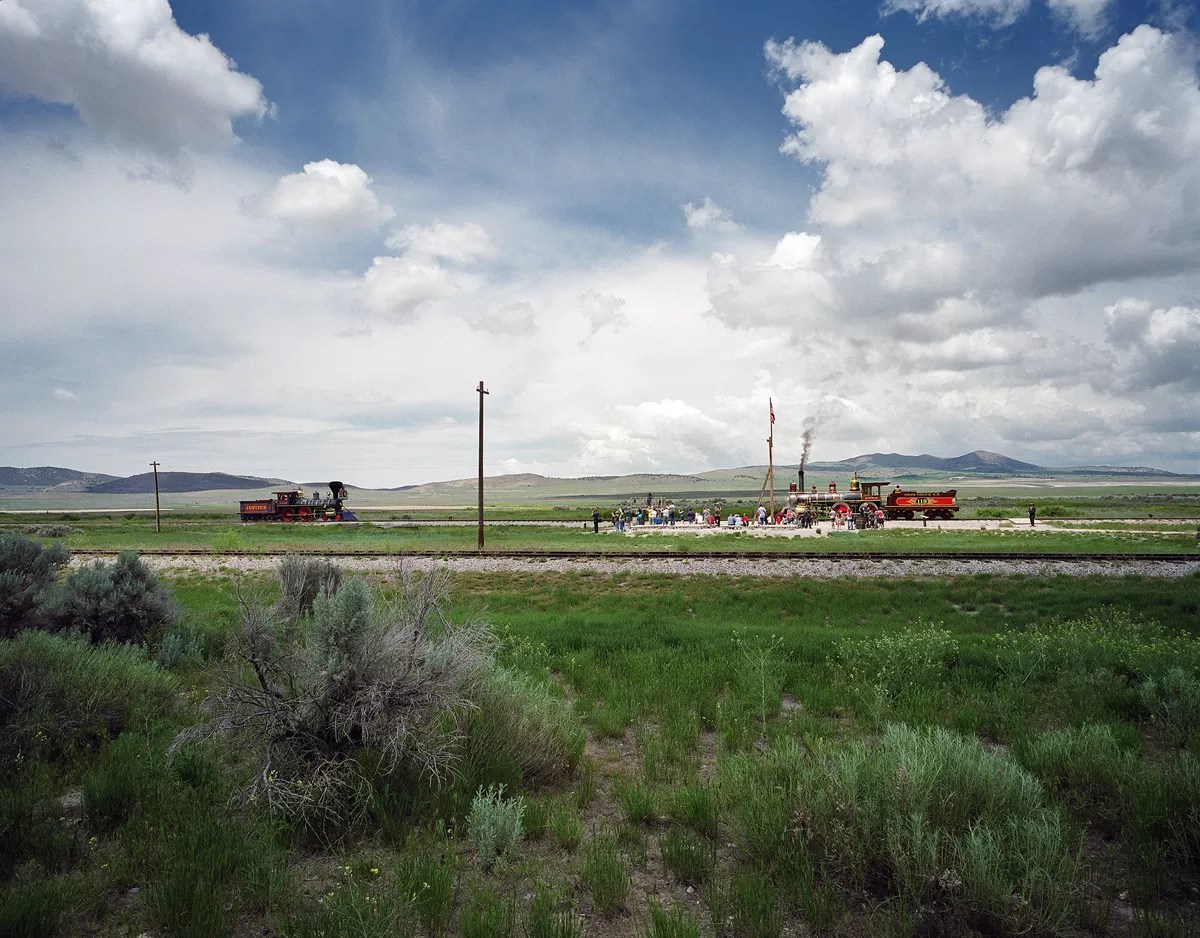 Kunkel’s soft spot for kitsch makes a nice segue to Edie Winograde: Place and Time: Reenactment Pageant, a show comprising color photos of historic reenactments. After all, what could be more kitsch than a bunch of middle-aged guys dressed up in costumes as they attempt to impersonate the cavalry on horseback or engineers driving old trains? Reenactments of historic milestones and battles are done around the country, but for this series, the Denver-based Winograde has focused on those held in the West. Her approach is not critical or ironic – not too much, anyway. Instead, she respects the sincerity of the efforts by presenting the various re-creations as she encounters them. These Winograde photos, all archival pigment prints, are pictorially rich and luxuriously carried out in vivid colors; their wide field of vision lends them a cinematic quality, as though they were film stills. Jacking up the sense of moving pictures are pieces that record movement, such as the action-movie-worthy “Decisive Battle of San Jacinto,” a restaging of the 1836 encounter in which Texas revolutionaries fought the Mexican army, a battle that led to the founding of the Texas Republic. The photo focuses solely on the men playing the revolutionaries charging across the simulated battlefield. “Meeting at Promontory Point” captures another cinematic moment, as two steam engines slowly inch toward each other to mark where the rail line from the East joined the one from the West to complete the first transcontinental rail line in Utah in 1869.